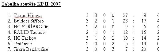 Okresní svaz ledního hokeje na svém jednání projednal výsledky utkání 3. kola KP II. ledního hokeje : Tatran Přimda - Trstěnice 8 : 2 HC Tachov - Buldoci Stříbro 3 : 7 Jiskra Bezdružice - HC STŘÍBRO 06 2 : 5 PROGRAM 4. KOLA : středa - ZS MARIÁNSKÉ LÁZNĚ 24.10.2007 20.00 hodin Trstěnice - HC Tachov středa - ZS TACHOV 24.10.2007 19.45 hodin Buldoci Stříbro - HC STŘÍBRO 06 neděle - ZS TACHOV 28.10.2007 16.00 hodin Tatran Přimda - RABID Tachov Všichni fanoušci hokeje jsou srdečně zváni ! Dne 23.10.2007:Zdeňka Kantová Pro reakci na článek musíte být přihlšen |