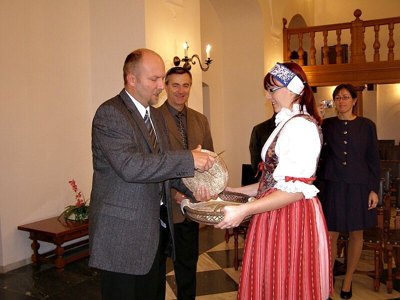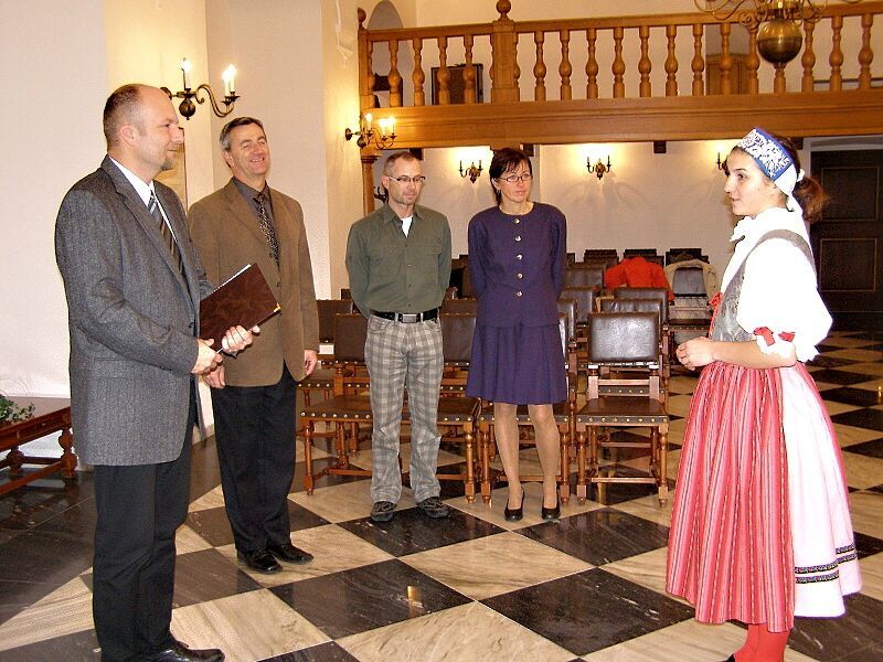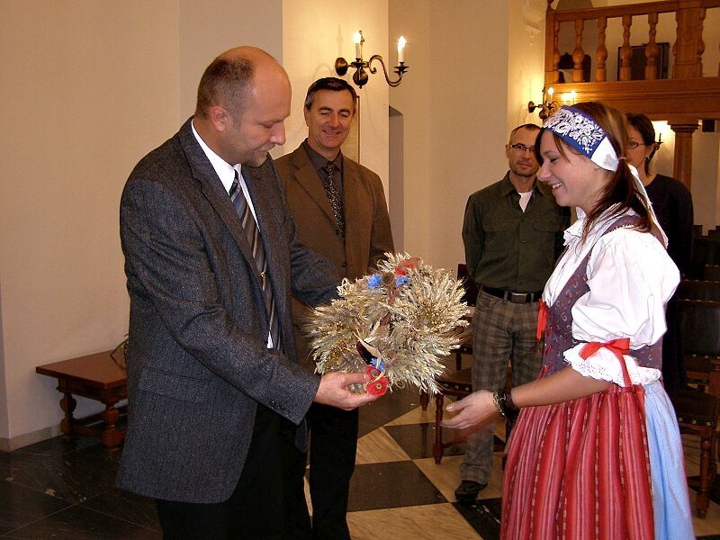 Na radnici děvčata v nových stříbrských krojích uvítal tajemník ... města Radek Strankmüller. Dlouhou tradici má předávání dožínkového věnce, který předávají studenti SOŠ ve Stříbře. Nejinak tomu bylo i letos. Na radnici se vypravily žačky třetího roku oboru agropodnikání SOŠ ve Stříbře. Na radnici děvčata v nových stříbrských krojích uvítal tajemník města Radek Strankmüller. Nové kroje nahradily staré baráčnické a vznikly díky pomoci Nadace Jakoubka ze Stříbra. Co je zajímavého na nových krojích???? Víte, co je vínek? Kdo předal věnec a kdo nabídl chléb se solí?? A jaké soutěže a veselí očekávalo studenty ve školní tělocvičně??? To vše se dozvíte v prosincovém zpravodaji..... Prozatím malá fotoreportáž............ Dne 10.11.2007:Martina Sihelská Pro reakci na článek musíte být přihlšen |