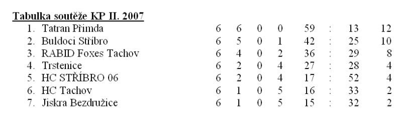 Okresní svaz ledního hokeje na svém jednání projednal výsledky utkání 7. kola KP II. ledního hokeje : HC STŘÍBRO 06 – Tatran Přimda 1 : 16 Jiskra Bezdružice – RABID Foxes Tachov 0 : 5 kontumačně HC Buldoci Stříbro – Trstěnice 5 : 2 PROGRAM 8. KOLA : středa - 21.11.2007 – 20.00 hodin ZS Tachov HC Buldoci Stříbro – RABID Foxes Tachov čtvrtek - 22.11.2007 - 18.15 hodin ZS Tachov HC STŘÍBRO 06 – HC Tachov neděle - 25.11.2007 - 19.15 hodin ZS Tachov Jiskra Bezdružice – Tatran Přimda Všichni fanoušci hokeje jsou srdečně zváni ! Jednání zástupců družstev se koná ve čtvrtek 13.prosince 2007 od 16.30 hodin v hale. KP I. ledního hokeje : sobota - 24.11.2007 - 18.00 hodin HC Tachov - TJ Břasy sobota 8.12.2007 - 18.00 hodin HC Tachov - KLH Božkov Dne 20.11.2007:Zdeňka Kantová Pro reakci na článek musíte být přihlšen |
