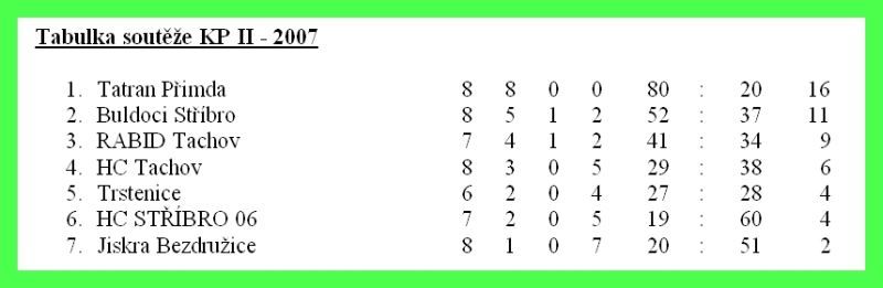 Okresní svaz ledního hokeje na svém jednání projednal výsledky utkání 8. a 9. kola KP II. ledního hokeje : HC Buldoci Stříbro - HC RABID Foxes Tachov 5 : 5 Jiskra Bezdružice - Tatran Přimda 2 : 14 HC STŘÍBRO 06 - HC Tachov 2 : 8 HC Tachov - Jiskra Bezdružice 5 :3 Tatran Přimda - HC Buldoci Stříbro 7 : 5 ZMĚNA UTKÁNÍ : pátek - 7.12.2007 - 20.00 hodin ZS Tachov HC RABID FOXES Tachov - Farmáři Trstěnice PROGRAM 10. KOLA : středa - 5.12.2007 - 20.00 hodin ZS Mariánské Lázně Farmáři Trstěnice - Tatran Přimda středa - 5.12.2007 - 20.00 hodin ZS Tachov HC Buldoci Stříbro - HC Tachov neděle - 9.12.2007 - 19.15 hodin ZS Tachov HC STŘÍBRO 06 - Jiskra Bezdružice PROGRAM 11. KOLA : čtvrtek - 13.12.2007 - 18.15 hodin ZS Tachov HC STŘÍBRO 06 - HC Buldoci Stříbro čtvrtek - 13.12.2007 - 20.30 hodin ZS Tachov HC Tachov - Farmáři Trstěnice sobota - 15.12.2007 - 16.00 hodin ZS Tachov HC RABID Foxes Tachov - Tatran Přimda Všichni fanoušci hokeje jsou srdečně zváni ! Jednání zástupců družstev se koná ve čtvrtek 13.prosince 2007 od 16.30 hodin v hale. KP I. ledního hokeje : sobota - 8.12.2007 - 18.00 hodin HC Tachov - KLH Božkov Dne 04.12.2007:Zdeňka Kantová Pro reakci na článek musíte být přihlšen |