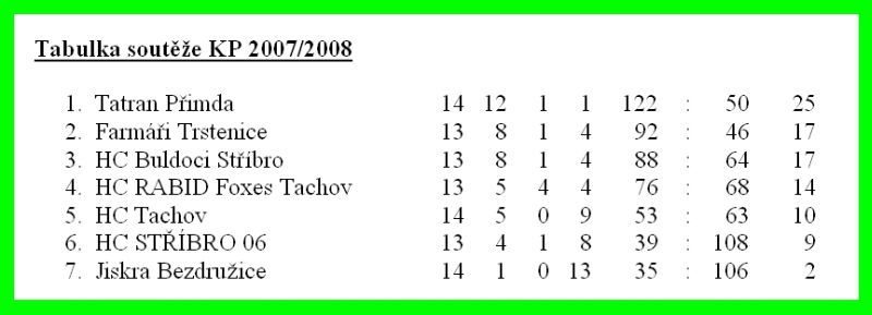 Okresní svaz ledního hokeje na svém jednání projednal ... výsledky utkání : č.44 Tatran Přimda – Jiskra Bezdružice 7 : 5 č.46 Jiskra Bezdružice – HC Tachov 1 : 6 č.47 HC Buldoci Stříbro – Tatran Přimda 5 : 7 č.48 Farmáři Trstenice – HC RABID Foxes Tachov 5 : 5 Utkání KP II. třídy ve Stříbře mezi celky HC Buldoci Stříbro a Tatran Přimda řídí místo rozhodčího Šína kolega Skácel. Jednání ŘK OSLH Tachov se uskuteční v pondělí 28.1.2008 od 16.00 hod. Dne 22.01.2008:Zdeňka Kantová Pro reakci na článek musíte být přihlšen |
