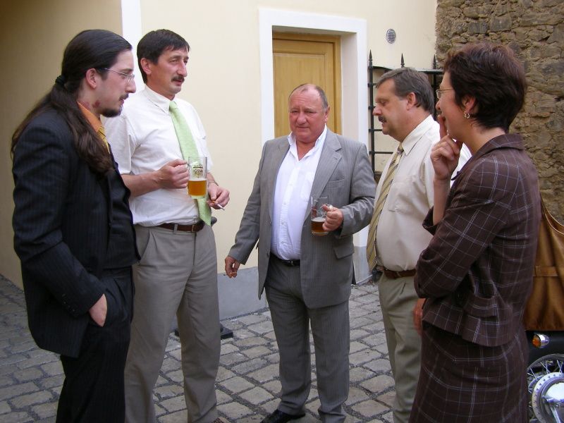Poslanec Parlamentu České republiky a stínový ministr ... kultury Vítězslav Jandák přijel do Stříbra, kde v doprovodu paní Doc. MUDr. Milady Emmerové, CSc. a Ing. Václava Votavy po slavnostním přivítání na radnici pobesedoval se členy místního divadelního spolku Divoch. „Mám rád tyto malé soubory. Měly by být hodně podporovány, hrají více skutečně a od srdce,“ chválil ochotnické spolky ministr. „Osobně bych navrhoval třísložkovou podporu těchto spolků, nejdříve by mělo přispět místo, kde mají ochotníci základnu, pak kraj a nakonec stát,“ vykreslil svou představu Jandák, který závěrem podepsal divadelníkům kroniku. „Jsme rádi, že jsme mohli s panem Jandákem pobesedovat, byla to taková informativní schůzka. Pan Jandák je schopný herec, nejvíce na mě zapůsobil ve filmech Metráček a Tři oříšky pro Popelku, jako herce si jej opravdu vážím,“ říká Laco Kajaba, člen divadelního souboru Divoch. Další dějství návštěvy se odehrávalo v restauraci Beseda, kde na ministra čekali stříbrští občané. Po této besedě se Jandák se svým doprovodem přemístil do pivovaru U Rybiček, aby ochutnal místní pivo. Z nabídky si vybral Argenta a neopominul ani důkladnou prohlídku varny. Dne 30.05.2008:Martina Sihelská Pro reakci na článek musíte být přihlšen |