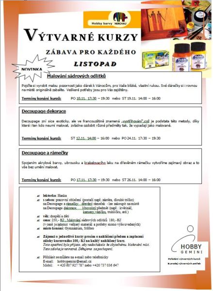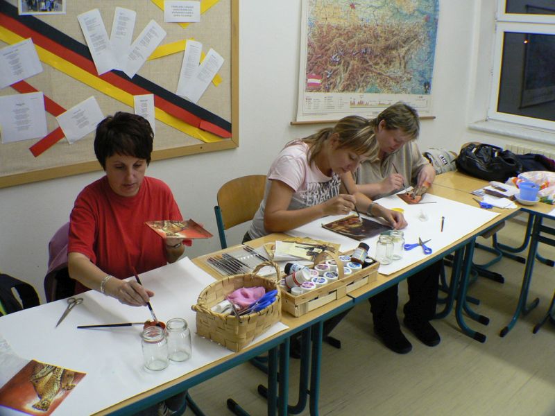 Na gymnáziu ve Stříbře se uskutečnily nové výtvarné kurzy ... V prostorách Gymnázia se uskutečnily dne 15. a 20. října od 17:30 hodin výtvarné kurzy Decoupage dekorace a Decoupage a rámečky. Pod článkem můžete vidět některé fotografie z těchto kurzů. Všichni účastníci se dozvěděli více o technice decoupage, vytvořili si originální výrobky a u toho se ještě v komorní atmosféře náramně pobavili. Tímto děkuji Mgr. Deredimosovi za poskytnutí těchto prostor, ve kterých se budou i nadále konat další výtvarné kurzy. Rozpis kurzů na měsíc listopad najdete na konci tohoto článku. Těšte se na různá překvapení, zábavu či relax, všichni jste srdečně zváni. Těšíme se na Vás … Hobby Gemini Dne 21.10.2008:hanka* Pro reakci na článek musíte být přihlšen |