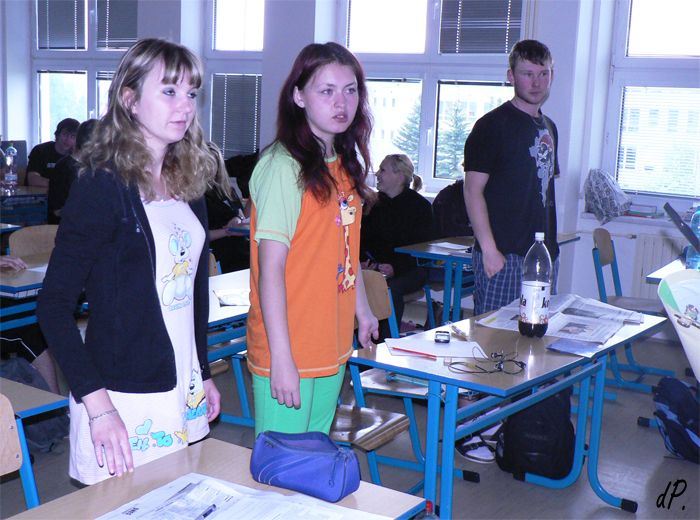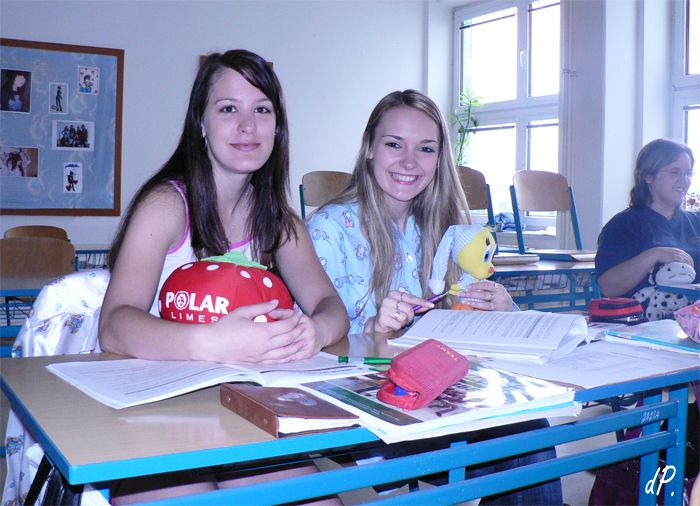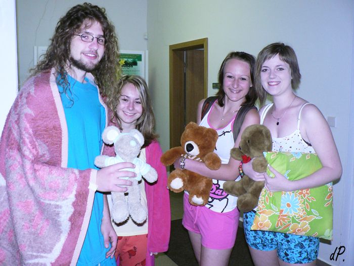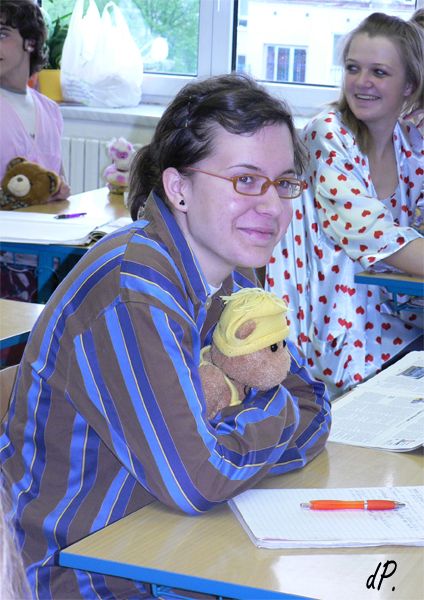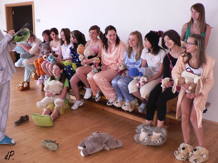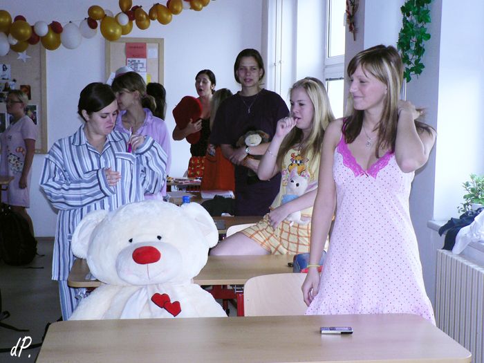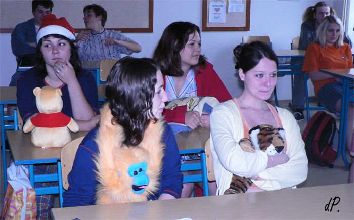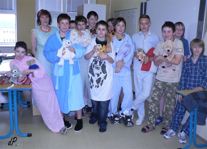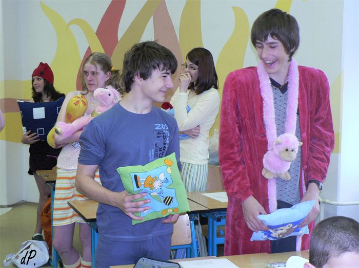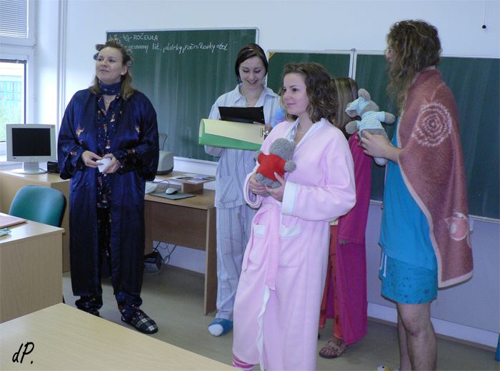 Velmi netradičně vypadala dnes výuka na gymnáziu. Studenti i učitelé si do školy vyrazili v pyžamech. Výuka probíhala klasicky, ovšem v nočním úboru. Celou akci, pojatou jako soutěž, navrhla a zorganizovala školní rada studentů. „Letošní rok to vyzkoušíme s tím, že uvidíme, jak se nápad chytne," prozradil Šimon Svoboda, člen školní rady, který ještě se třemi svými spolužačkami obcházel jednotlivé třídy a hodnotil úbory na spaní. Hlavním kritériem bylo vtipné pyžamo a doplněk (plyšák, natáčky apod.) Studenti oblékli opravdu zajímavé kreace. Vybrat nejvtipnější převlek byl oříšek. Zejména OA4 se zhostila recesistické akce velmi dobře a „zodpovědně" - v pyžamu tu byl téměř každý. Výhrou pro celou třídu byl dort a ten získala právě OA4. „Myslíme si, že se nám akce vydařila," pochvalovali si organizátoři svůj nápad, „ příští rok by se mohli zapojit i další zaměstnanci školy. Když recese, tak pořádná!" Dne 29.04.2009:Pavla Deredimosová 29.04.2009 - 21:24:50 aja - Nejsem si jistá, zda byly dorty dva, ale jeden "vítězný" obdržela stoprocentně prima, tj. třída G1, kde byli v pyžamech úplně všichni včetně třídní samozřejmě. Nicméně OA4 (včetně třídní)si pochvalu určitě zaslouží. Pro reakci na článek musíte být přihlšen |