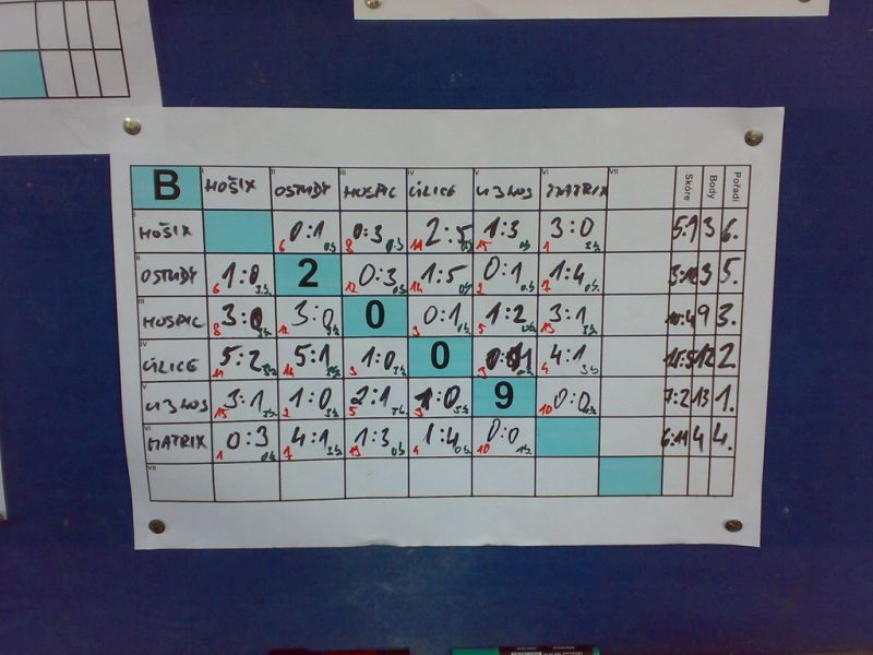 A: 1. Čučorietky, 2. Marná snaha, 3. Lužná, 4. CM transport, 5. Holostřevy B: 1. U3nos, 2. Úlice, 3. Hospic, 4. Matrix, 5. Ostudy, 6. HošiX
