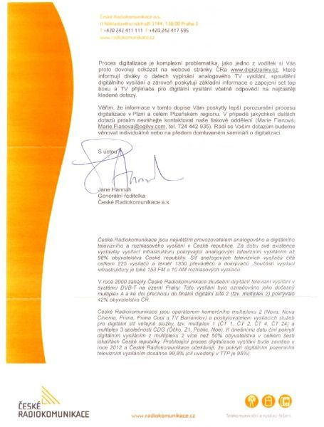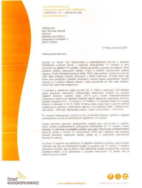 Dopis Českých radiokomunikací a.s. k ukončení ... analogového vysílání starostovi města - klikněte níže: Dne 22.09.2009:Marcela Nováková, MěÚ Stříbro 22.09.2009 - 14:08:31 Pepa - Problematiku řeší např. článek http://www.stribro.cz/cti.php?id=3551 Pro reakci na článek musíte být přihlšen |