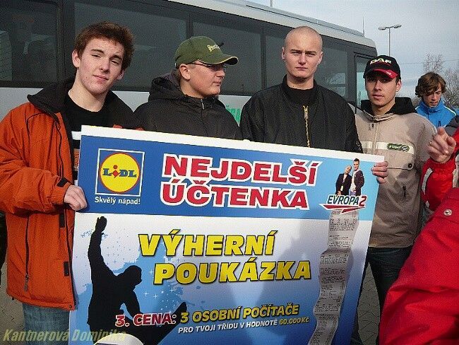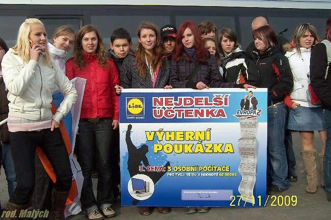 Aktuální zpráva z Prahy - FOTO !!! Z Prahy zpráva, že stříbrská třída 2AC ze SOŠ vyhrála třetí cenu v soutěži Lidlu o nejdelší účtenku! Studenti měli velkou radost a cestu pro výhru spojili i s výletem po hlavním městě. Společnými silami dokázali vytvořit účtenku o délce 1.280m. "Před námi bylo na prvním místě Brno, které mělo 2,5 kilometru a druzí byli žáci z Opatova, kteří měli účtenku dlouhou 1.435m," řekla nám paní Jitka Malá. Celou akci pro rádio Evropa2 moderoval Patrik Hezucký. Děkuji p. Malé za výbornou a rychlou spolupráci! Dne 27.11.2009:Martina Sihelská Pro reakci na článek musíte být přihlšen |