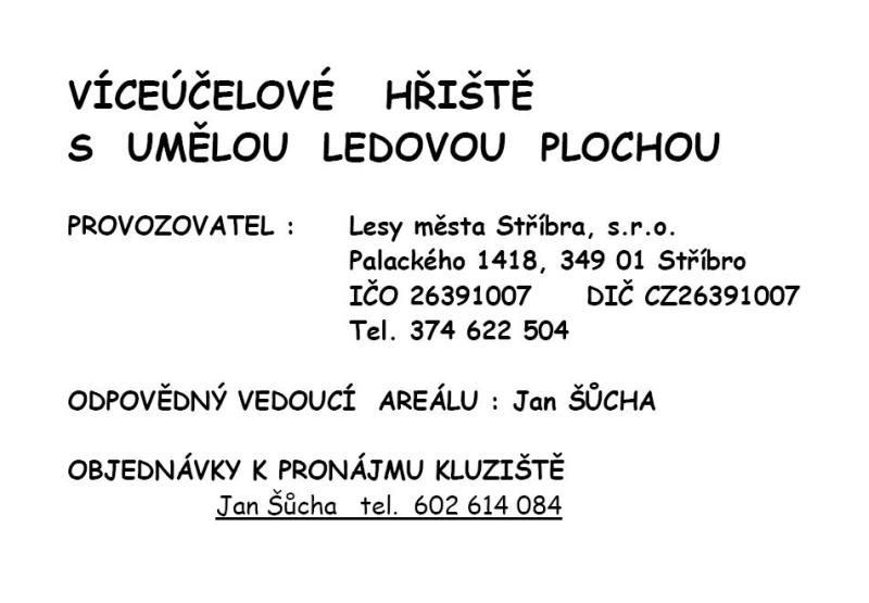 Město Stříbro a Lesy města Stříbra s.r.o. oznamují, ... že víceúčelové hřiště - LEDOVÁ PLOCHA na zimním stadionu ve Stříbře byla již otevřena. Informace a objednávky na pronájem plochy přijímá p. Šůcha, tel. 602 614 084. Volné bruslení: