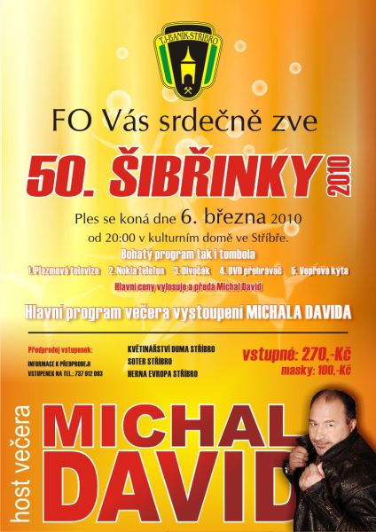 Již jen několik volných stolů zbývá na 50. Šibřinky... které se uskuteční 6.3.2010 v Kulturním domě ve Stříbře. K tanci a poslechu bude hrát Union a jako host večera vystoupí Michal David, který zároveň předá hlavní ceny tomboly. vyhrát můžete Plazmovou televizi, mobilní telefon, divočáka, DVD přehrávač a další hodnotné ceny. Poslední vstupenky jsou v prodeji v květinářství DUMA.