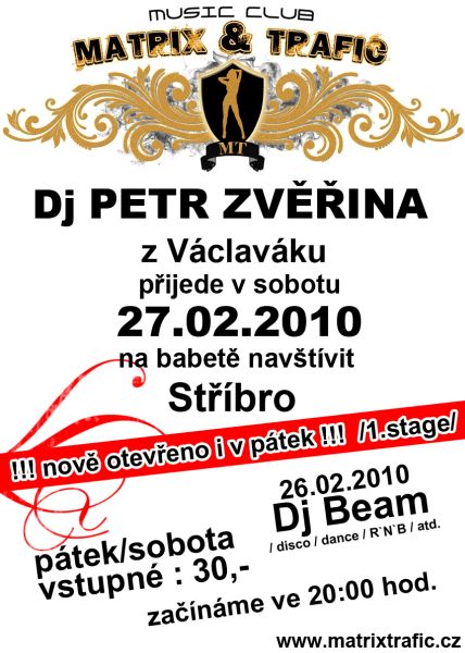 27.02.2010 (sobota) - Dj PETR ZVĚŘINA z Václaváku:-) Program na poslední víkend v únoru! Už se můžete těšit na program na měsíc březen, kde vás čeká spousta zajímavých akcí! Dne 23.02.2010:Marcela Švýcarská Pro reakci na článek musíte být přihlšen |