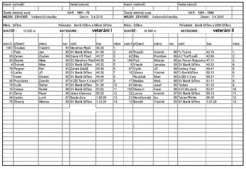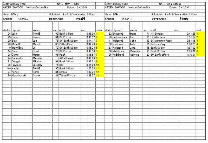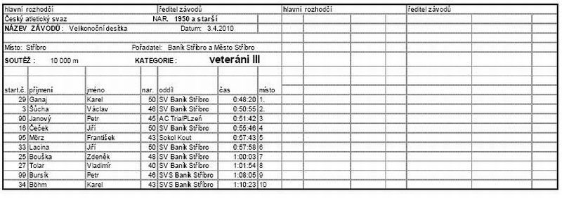 Poletování sněhových vloček ráno 3. dubna 2010 … nenasvědčovalo tomu, že by byly Velikonoce. Narůstající počet osobních aut u stadionu Baníku Stříbro však svědčil o tom, že se sjíždějí účastníci Velikonoční desítky, jejíž již 25. ročník připravili pořadatelé z oddílu atletiky TJ Baník Stříbro společně s Domem dětí a mládeže Stříbro. Také počasí se umoudřilo, takže start závodu i příchozích pěších účastníků proběhl v již velikonoční atmosféře za slunečného počasí. Startérem závodu byl ing. Václav Votava, který také převzal záštitu nad tímto závodem. Odstartovalo 57 závodníků a 28 pěších. Závod se odehrával v režii Tomáše Jaši, závodníka Baníku Stříbro. I když se v poslední době necítil nejlépe, vyrazil od začátku do čela a bylo jen otázkou, s jakým náskokem doběhne do cíle. A ten mu v cíli naměřili rozhodčí ve výši 1 minuta a 23 vteřiny. Na druhém místě doběhl po dobrém výkonu Vlastimil Šroubek starší z SC Marathon Plzeň, který vyhrál kategorii veteránů do 50 let. Velmi dobrý výkon podala vítězka kategorie žen Ivana Sekyrová z AK Sokolov. Zaběhla vynikající čas 41:26 min. a byla celkově 3. Na druhém místě v kategorii žen se umístila Eva Hejtmánková z LK Abertamy a 3. Soňa Millerová z SC Marathon Plzeň. V hlavní kategorii mužů doběhl za Tomášem Jašou závodník Tatranu Přimda Lukáš Suda v čase 43:52 min. před třetím Janem Bíbou z SV Baník Stříbro (44:17 min.). V kategorii veteránů do 50 let si pro 2. místo za Vlastimilem Šroubkem doběhl Jan Flaks z SV Baník Stříbro, loňský vítěz Bodit cupu. Rozhodčí mu naměřili v cíli 41:38 min. V cíli měl náskok na 3. Zbyška Zemana ze Slavie VŠ Plzeň téměř 2 minuty. Vítězem veteránů do 60 let se stal Antonín Pospíšil z TJ Tlučná. Jeho čas 42:13 min. je kvalitní stejně jako čas 2. závodníka v cíli Františka Šiky z AC Trial Plzeň (43:08 min.). 3. doběhl Miloslav Fryč z Falconu Rokycany (47:11 min.). Po dlouhé době byla velmi početně obsazena kategorie veteránů nad 60 let. Vítězem se stal Karel Ganaj z SV Baníku Stříbro v čase 48:20 min. Druhý doběhl Václav Šůcha ze stejného oddílu (50:55 min.) a třetí Petr Janový z AC Trial Plzeň (51:42 min.) Startoval také Petr Bursík, který jako jediný absolvoval všech 25 dosud pořádaných ročníků. Účastníci byli spokojeni s tratí, ale také s Velikonoční pomlázkou, kterou poskytli Ehrmann Stříbro (jogurty), Dům dětí a mládeže (čokoládový zajíček, Sport Podestát slevu na obuv 20 %, Velikonoční mazanec poslanec ing. Votava. Dne 05.04.2010:Ing. Vladislav Moravec Pro reakci na článek musíte být přihlšen |