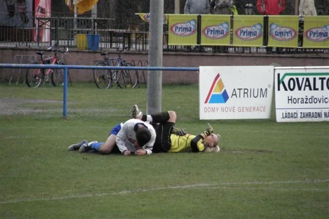 Fotbalisté Baníku smazali dvoubrankové vedení soupeře a přivezli alespoň bod… První poločas nepřinesl pohledný fotbal. Míč více než po trávníku putoval vzduchem a kombinační hra obou mužstev vázla. Více ze hry však měli domácí. V 10. minutě ztratili stříbrští hráči míč ve středu hřiště a na Cipra postupoval sám Janouškovec, který naštěstí nezakončil mezi tyče. Další varování pro Baník znamenal střelecký pokus Jůdy. I on však z hranice vápna pálil jen vedle branky Baníku. Domácí byli i nadále aktivnější a svou aktivitu dokázali ve 25. minutě přetavit ve vedoucí branku. Přímý kop Mičkala ještě Šaman odhlavičkoval, ale míč se dostal k Dytrtovi, který nechytatelnou střelou rozjásal domácí fanoušky - 1:0. I další standardní situace v podobě přímého kopu ve 30. minutě znamenala pohromu pro Baník. K míči se postavil domácí Sova a střelou k tyči překonal Cipra podruhé - 2:0. V tuto chvíli to s Baníkovci nevypadalo dobře. Přece však jen do konce poločasu měli 2 možnosti ohrozit domácí branku. Horažďovický Kozlík však vždy včas stihl vyběhnout a před dotírajícím Ábelem uklidit míč do bezpečí.