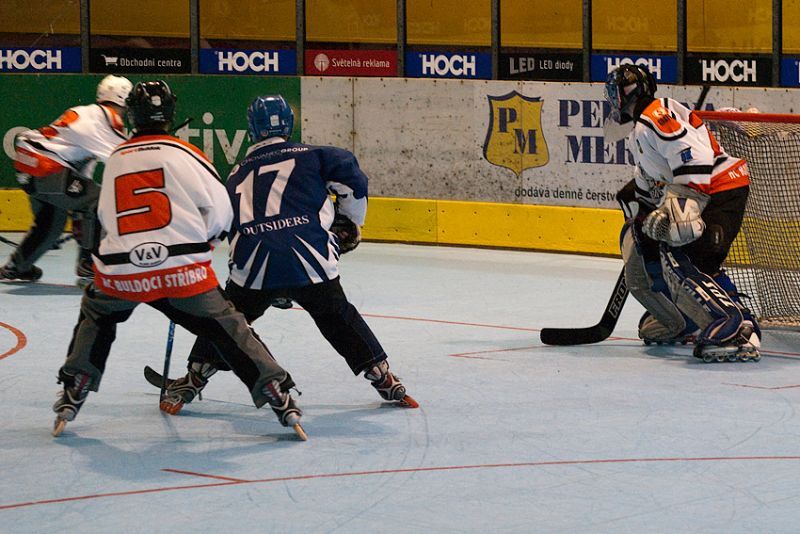 V neděli stříbrský tým odehrál premiérový zápas HC Buldoci Stříbro jako jediné západočeské mužstvo vstoupili v letošní sezóně do soutěže v inline hokeji, konkrétně do divize Jih v 1. lize. Jako první soupeř je čekal tým z líhně tohoto sportu u nás, mužstvo Outsiders Pardubice. Hráči stříbrského celku přijížděli na první domácí zápas do Písku s cílem sehrát zápas, za který by se neměli stydět. V tom jim vůbec nepomohla informace, že dnešní soupeř přehrál v sobotních zápasech týmy z Písku (13:12) a Soběslavi (6:4). V první čtvrtině (pozn. autora: inline se hraje 4x 12 min.) hra Buldoků vykazovala známky velkého respektu k soupeři, kterému se navíc povedlo v 7. minutě překonat gólmana Tomáše Dudíka. Postupně hráči Buldoků ztratili ostych a pouštěli se do protiútoků. První vyrovnání přišlo z hole kapitána mužstva Petra Staňka. V polovině zápasu ukazovala světelná tabule skóre 2:2. Na začátku třetí čtvrtiny se dostali Buldoci poprvé do vedení, ale v touze po další brance velmi otevřeli svojí obranu. Toho pardubičtí využili a obrátili stav zápasu ve svůj prospěch. Ve 36. minutě našel Jarda Houdek Matěje Sýkoru a ten prudkou střelou vyrovnal na 4:4. V poslední čtvrtině Buldoci zaskočili soupeře dvěma rychlými góly. Nejdříve dorazil nastřelený puk mezi betony Martin Sládek a vedení pojistil Jan Šůcha. Outsideři se ale nevzdávali. V přesilové hře dělovkou snížili tři minuty před koncem regulérní hrací doby a poté bez brankáře se snažili o vyrovnání. To už ale Buldoci nedopustili, a tak se mohli radovat z prvního vítězství. Václav Šůcha – vedoucí týmu zhodnotil zápas slovy: „Před tímto zápasem jsme měli pochybnosti jestli jsme se neunáhlili, když jsme se rozhodli vstoupit do soutěže. Na začátku jsme museli překonat několik překážek. Tou největší byla a zatím zůstává skutečnost, že ve Stříbře chybí zastřešená plocha. Zatím jsme našli zázemí v hokejbalové hale HBC Plzeň, kde sehrajeme již příští utkání. Mám radost z nových posil. Velký dík pak patří našemu gólmanovi Tomášovi Dudíkovi, který v brance doslova čaroval. Doufám, že to nebyla poslední výhra a chtěl bych pozvat všechny naše příznivce na zápas proti Spartaku Soběslav, který hrajeme v sobotu 15.5. od 20.00 hod. v Plzni.“