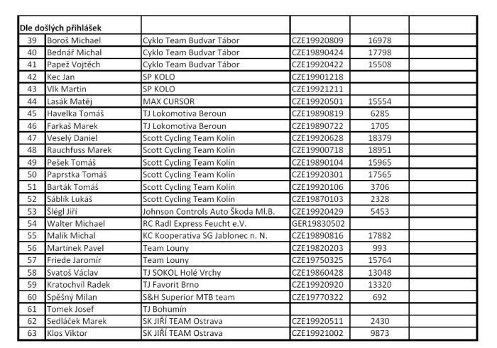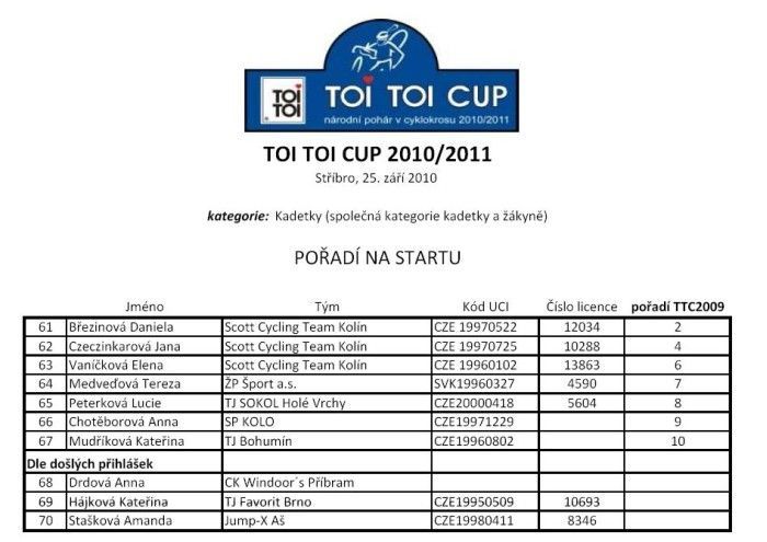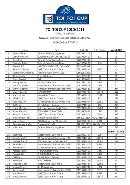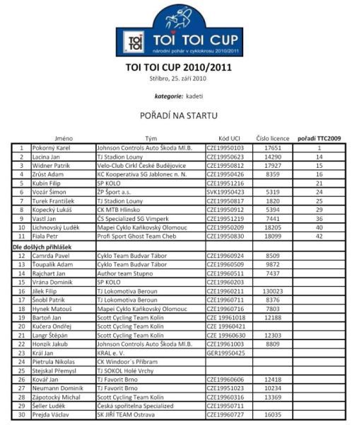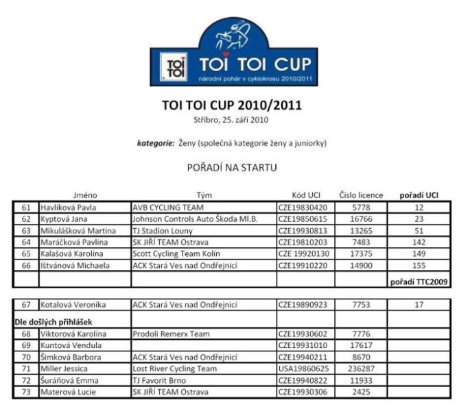 Zveřejněna startovka Elite sobotního závodu. ... I když už byla oficiální uzávěrka přihlášek, přesto se někteří jezdci přihlašují ještě před závodem, takže zveřejněná startovní listina ještě nemusí být konečná. Hlavním tahákem startovní listiny je samozřejmě domácí mistr světa Zdeněk Štybar. Nicméně radostná zpráva přišla od Petra Dlaska, který se zranil na začátku září při etapovém závodě Okolo Slovenska. „Zdravotní stav se zlepšil, tak jsem se rozhodl jít na sobotní start prvního Toi Toi Cupu ve Stříbře. Držte mi palce." vzkazuje týmový kolega Zdeňka Štybara Petr Dlask, takže sympatického dlouhána ve Stříbře opět uvidíme. Vloni dojel třetí. Hůře je na tom Martin Bína, vloni ve Stříbře druhý a čtvrtý na MS v Táboře, který se podrobil drobnému chirurgickému zákroku. Ten bohužel závod ve Stříbře nestihne a nestihne ani následný úterní závod v Lounech. Na startu se ale objeví Martin Zlámalík, který jezdí taktéž v Belgii a další Štybarův týmový kolega Slovák Robert Gavenda. Vedle celé české cyklokrosové špičky budou na startu i další známá jména - ze Slovenska Robert Glajza, z Německa Johannes Sickmueller či Rob Peeters z Belgie. Na startu se objeví i jezdci z české MTB špičky. Mistr Evropy a vicemistr světa z cross country horských kol Jaroslav Kulhavý bohužel ne, i když cyklokros chce v této sezóně jezdit, protože ještě nemá postavená cyklokrosová kola. Na startu se ale objeví i plzeňský Milan Spěšný, vloni šestý na ME MTB. Máme se tedy na co těšit a bude komu fandit. Jízda dětí s mistrem světa Zdeňkem Štybarem 24.9.2010. Český pohár v cyklokrosu 25.9.2010 ve Stříbře. - podrobné info v menu pod záložkou TOI TOI Cup. Dne 24.09.2010:Ing. Josef Hrábek #ZŠ# Pro reakci na článek musíte být přihlšen |