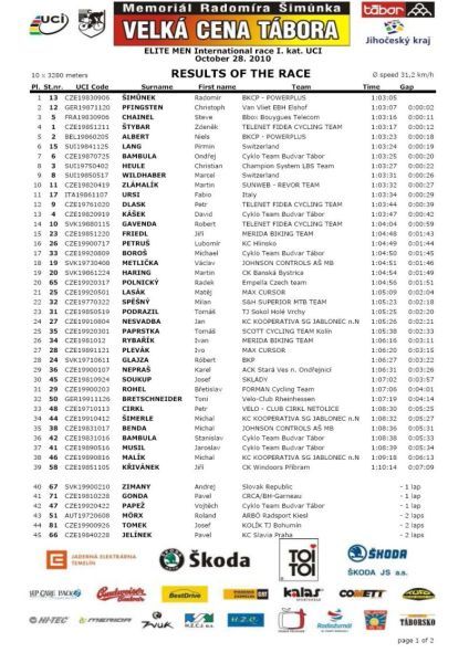 O svátku 28. října 2010 jeli Elite muži cyklokrosový závod ... I.kategorie UCI v Táboře jako memoriál Radomíra Šimůnka staršího, který letos v srpnu zemřel. Před tímto závodem se jeli ostatní kategorie v rámci Českého národního cyklokrosového poháru. Na závod nedorazila celá cyklokrosová špička, která byla v neděli v Plzni, protože se ve středu konala v belgické televizi show, na které musela být díky smluvním povinnostem celá světová cyklokrosová špička. A ne všem se chtělo vracet ve čtvrtek zpět do ČR. Zdeněk po závodě řekl, že se z televize dostal do postele v jednu hodinu ráno a v pět už zase vstával na letadlo. Nicméně i tak se pořadatelům podařilo dostat na start kvalitní zahraniční závodníky včetně Nielse Alberta, který jezdí s Radkem Šimůnkem za stejnou stáj. Těsně před startem se uskutečnil pietní akt, při kterém byly připomenuty úspěchy a osobnost zemřelého Radomíra Šimůnka staršího, promluvila jeho pozůstalá manželka Jana i syn Dany. Památka Radka Šimůnka staršího byla poté uctěna minutou ticha. Hned od startu vyrazil vpřed obrovsky namotivovaný Radomír Šimůnek a za ním Němec Christoph Pfingsten, který vyhrál závod Českého poháru v Uničově. Tato dobře spolupracující dvojice nakonec v půlminutovém úniku jezdila až do posledního kola spolu. Za nimi se utvořila na pevném rychlém povrchu za slunečného podzimního počasí dvanáctičlenná skupina se všemi ostatními favority, ze které v předposledním kole vystartovali Štybar s Albertem, ale když jejich nástup zachytili Francouz Chainel se Zlámalíkem, tak se skupina opět sjela. V posledním kole jel Radek Šimůnek naplno a získal na Pfingstena nepatrný náskok, který si udržel až do cíle, třetí dojel Francouz Chainel před Štybarem a Albertem.