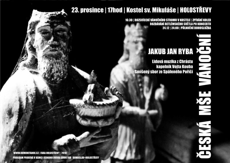 Rybova mše vánoční v kostele sv. Mikuláše od 17:00 Program předvánočního večera: 16:30 rozsvěcování vánočního stromku a zpívání koled v kostele 17:00 začátek koncertu: Rybova mše vánoční 18:00 rozdávání Betlémského světla