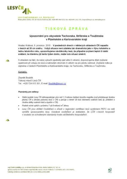 Upozornění pro obyvatele Stříbrska! ... V posledních dnech v některých oblastech ČR napadlo v lesích až 30 cm sněhu. I když situace není zdaleka tak dramatická jako v říjnu loňského a lednu letošního roku, upozorňujeme návštěvníky lesů, že případné zvýšení teplot či další sněžení, ke kterému již tento týden došlo, může tuto situaci změnit. S ohledem na fakt, že nelze vyloučit ojedinělý pád větví či stromů, doporučujeme dbát zvýšené opatrnosti při vstupu do lesů a nahnutým stromům či větvím se pro jistotu vyhnout. Zvýšené riziko je zejména v částech Plzeňského a Karlovarského kraje, na Tachovsku, Stříbrsku a Toužimsku. Dne 08.12.2010:Lesy ČR Pro reakci na článek musíte být přihlšen |