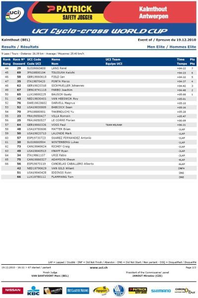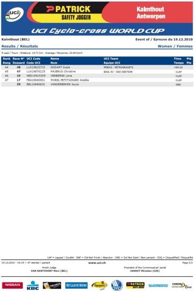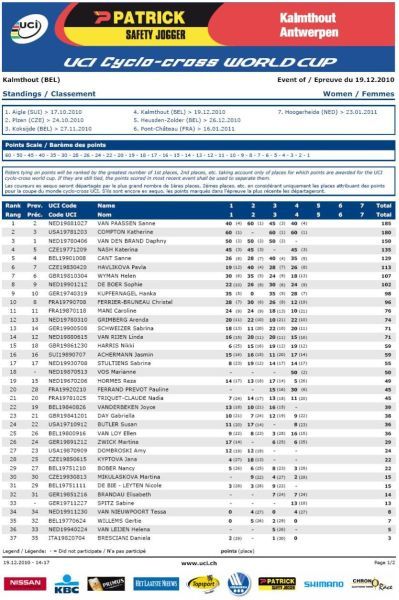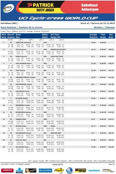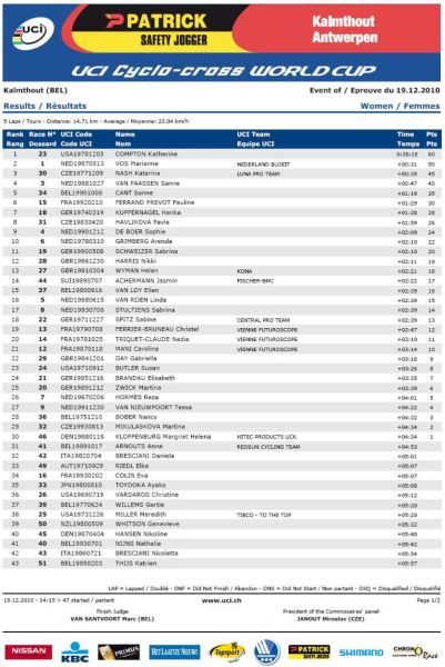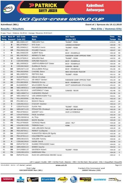 na osmém místě Havlíková i Šimůnek, Zlámalík desátý. ... Kateřina Nashová si po získání titulu mistryně ČR v cyklokrosu minulou sobotu v Mnichově Hradišti dojela pro bronz v nedělním závodě světového poháru na zasněžené trati v belgickém Kalmthoutu, průběžně je čtvrtá. Dobrý výsledek našeho ženského cyklokrosu podtrhla ještě osmým místem Pavla Havlíková, průběžně šestá. Radomír Šimůnek nezopakoval svůj sobotní výkon a dojel osmý (průběžně 20.), Zlámalík pak desátý (průběžně 25.). Za mrazivého počasí se mezi doslova „domácí" jezdce Toma Meeusena a Kevina Pauwelse dostal pouze Sven Nys, když ho Tom Meeusen v cílovém spurtu porazil. Zdeněk Štybar, který kvůli kolenu nejel už druhý svěťák, se propadl na průběžné šesté místo. Mezi juniory se do první desítky dostali sedmý Vojtěch Nipl, osmý Jakub Skála a desátý Tomáš Medek. Video - sestřih Světový pohár Kalmthout, Belgie 19.12.2010 muži. TV záznam ČT4 Sport - Světový pohár Kalmthout, Belgie 19.12.2010 muži. Video - na návštěvě u rehabilitujícího Zdeňka Štybara. Záznam Mistrovství ČR žen a mládežnických kategorií Mnichovo Hradiště 11.12.2010. Zdeněk Štybar si do Vánoc nezazávodí! Pojeďte na mistrovství republiky v cyklokrosu. Pojeďte na mistrovství světa v cyklokrosu. Jak se stát členem Fan klubu Zdeňka Štybara? Dne 19.12.2010:Ing. Josef Hrábek #ZŠ# Pro reakci na článek musíte být přihlšen |