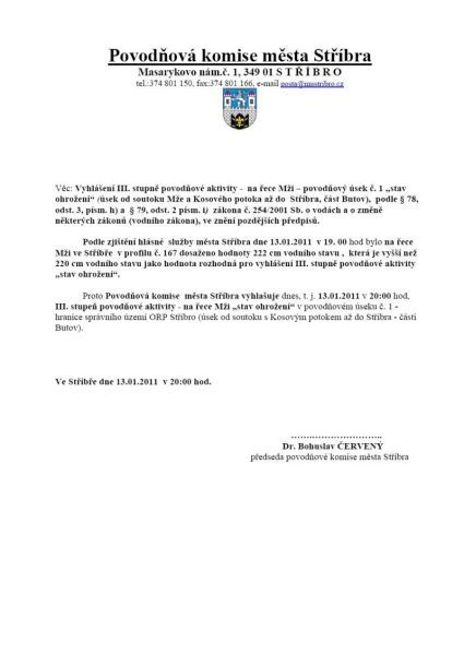 Povodňová komise vyhlásila III. stupeň povodňové aktivity. ... Vážení, Vratislav Maňák Pozn. redakce: Tato zpráva byla zaslána v noci na firemní e-mailovou adresu pracovníka, který byl bohužel celý pátek na služební cestě, proto došlo ke zpoždění zveřejnění. Informace ke zveřejnění je nutné posílat na e-mailovou adresu hotline@stribro.cz, kterou kdykoli najdete v kontaktech. V případě potřeby urgentního zveřejnění je možné po poslání e-mailu ještě zatelefonovat. Dne 14.01.2011:Vratislav Maňák Pro reakci na článek musíte být přihlšen |