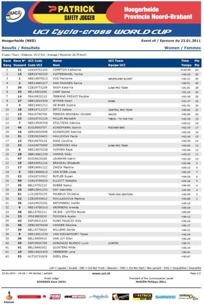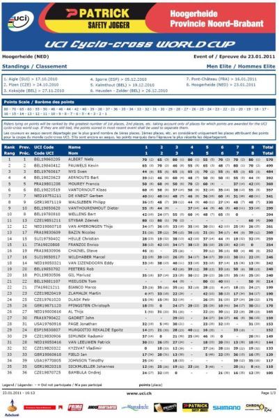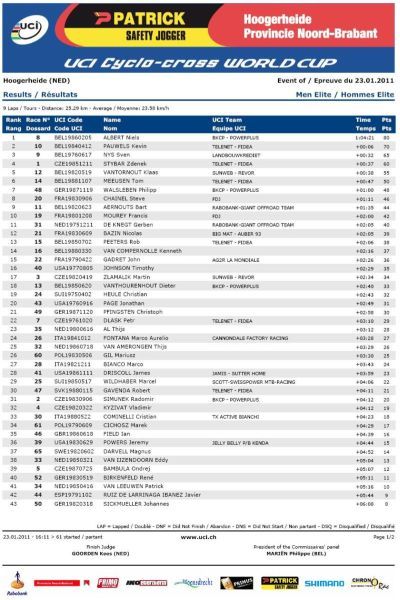 Výsledky World Cup Hoogerheide Nizozemí 23.1.2011: Záznam ČT4 na internetu - World Cup Hoogerheide Nizozemí 23.1.2011. Video - poslední kolo Hoogerheide Nizozemí 23.1.2011. Výsledková listina World Cup Hoogerheide Nizozemí 23.1.2011 - muži, ženy, U23 a junioři. Konečné výsledky World Cup 2010/2011 - muži, ženy, U23 a junioři. Pojeďte na mistrovství světa v cyklokrosu. Jak se stát členem Fan klubu Zdeňka Štybara? Dne 23.01.2011:Ing. Josef Hrábek #ZŠ# Pro reakci na článek musíte být přihlšen |
