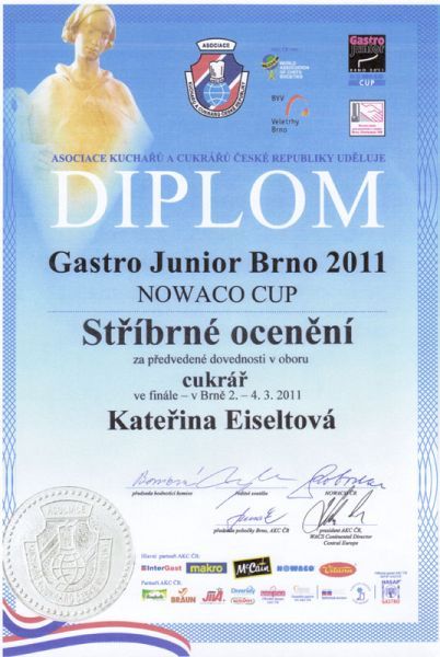 Kateřina Eiseltová uspěla v mezinárodní soutěži. Talentovaná studentka Střední zemědělské a potravinářské školy v Klatovech slečna Kateřina Eiseltová ze Stříbra se zúčastnila mezinárodní soutěže GASTRO JUNIOR - NOWACO CUP 2010/2011. Jakého úspěchu dosáhla a v jakém oboru soutěžila? Odpovědi naleznete v níže uvedeném rozhovoru, který pro Stribro.cz slečna Katka poskytla. Přibližte prosím našim čtenářům soutěž GASTRO JUNIOR - NOWACO CUP. O jakou soutěž se jedná? Jde o mezinárodní soutěž pro studenty gastronomických škol a středních škol, které mají gastronomické obory. Finále soutěže se konalo v Brně od 2. do 4. března 2011. Soutěžila jsem v oboru cukrář a zadání soutěžního úkolu bylo: Příprava 4 porcí moderního dezertu v časovém limitu 45 minut, jehož základní surovinou je čerstvá živočišná smetana ke šlehání. Po uplynutí soutěžního času jsem si dezert musela obhájit před odbornou komisí složenou z členů Asociace kuchařů a cukrářů České republiky. Mě hodnotila paní Pavlína Berzsiová a pan František Buchal. Čím jste vybojovala Stříbrné umístění v oboru cukrář? Vytvářela jsem dezert s tekutou čokoládou přelitý smetanovou omáčkou a doplněný limetkovo-smetanovým dortíkem a malinovou sedlinou. Dezert je součástí tříchodového restauračního menu pro mezinárodní klientelu Za jakou školu jste soutěžila? Reprezentovala jsem Střední zemědělskou a potravinářskou školu v Klatovech, kterou 3. rokem navštěvuji a můj dík patří paní mistrové Evě Sedláčkové, která mě na soutěž dlouho připravovala a věnovala mi v tomto ohledu hodně času.