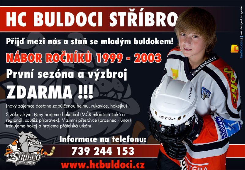HC Buldoci Stříbro dělají nábor ročníků 1999 - 2003 Hokejový klub Buldoci Stříbro se věnuje již pátým rokem výchově mládeže. Práce započala s otevření víceúčelového hřiště v prosinci 2007 (viz. foto). V prvních letech bylo zaměření pouze hokej. Bohužel zázemí pro přípravu mladých hokejistů neumožňoval plnohodnotnou přípravu a tak se vedení klubu rozhodlo využít nabídku hokejbalového svazu. V sezóně 2010-2011 vstoupili Buldoci s mladšími žáky do MČR v hokejbalu, kde obsadili v západní skupině konečné 5. místo s 16 body. Do této sezóny připravili dva týmy, přípravku a mladší žáky. Jelikož Buldoci chtějí i nadále rozvíjet mladežnický hokejbal (hokej) ve Stříbře, hledají nové hráče(ky) z ročníků 1999 - 2003 (u holek až 1997). Vedení klubu připravilo pro případné zájemce možnost vyzkoušet si zahrát jednu sezónu, aniž by museli rodiče investovat jakékoliv finance. První sezónu bude nováčkům zapůjčena výzbroj (helma, rukavice a hokejka), dále nebudou muset platit členský příspěvek. Kluci a holky, případně rodiče můžou své dotazy a zájem směřovat k vedoucímu mládeže Václavu Šůchovi na tel.č.: 739 244 153, od kterého dostanou bližší informace. Pozn.: V zimní pauze (prosinec-únor) se věnujeme tréninku hokeje. Webové stránky hokejového kluby Buldoci Stříbro.