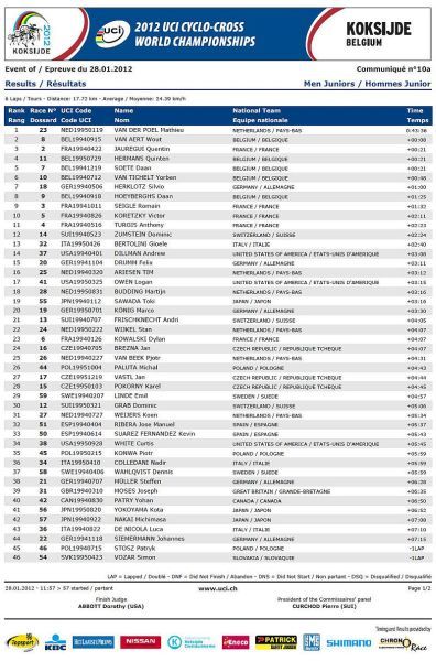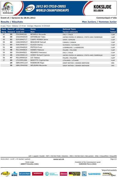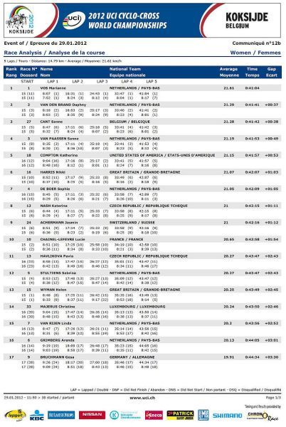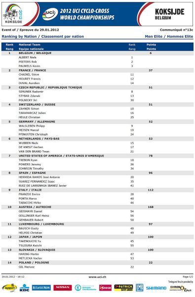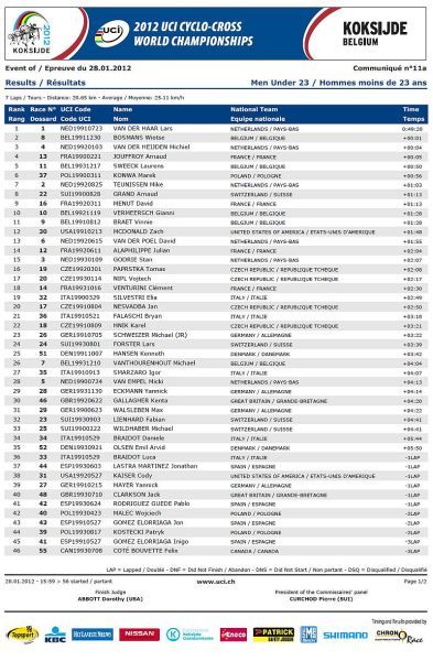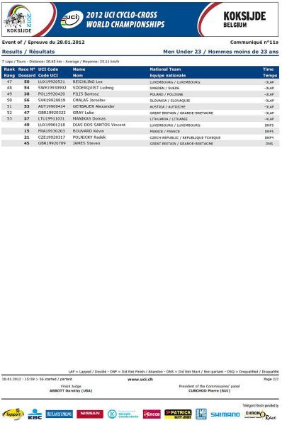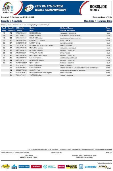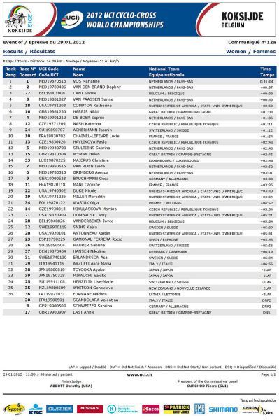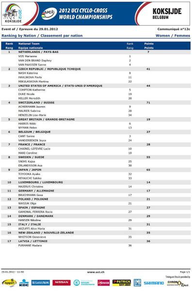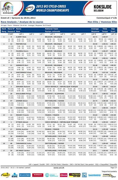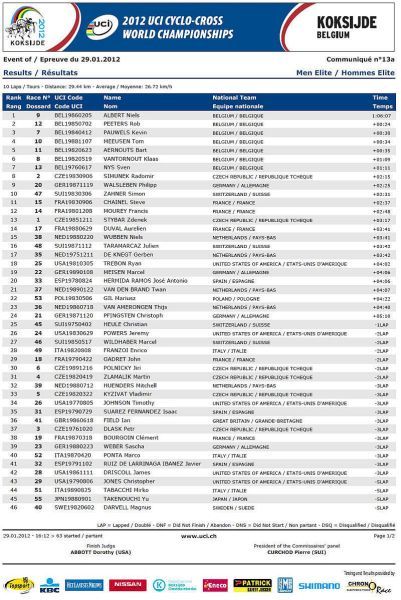 Češi bez medaile, jen osmá místa Nashové a Šimůnka. … V sobotu na mistrovství světa v cyklokrosu na písčité trati v belgickém Koksijde jeli dopoledne junioři a odpoledne třiadvacítkáři. Nejenže nikdo z našich nepřekvapil, ale oproti předchozím rokům došlo k podstatnému ústupu z předních příček! V nedělním dopoledni zůstaly za očekáváním i ženy, které už špatně odstartovaly. Kateřina Nash se sice probojovala v průběhu závodu až na čtvrté místo, ale v druhé polovině závodu pak ztrácela pozice až na konečné osmé místo. Katka si nejspíše vybrala daň, že poprvé závodila na tomto okruhu se specifickým belgickým pískem. Pavla Havlíková dojela jedenáctá a Martina Mikulášková 22. To ale stačilo na výborné druhé místo v hodnocení národů. V hlavním závodě mužů se podařilo dobře odstartovat Štybarovi se Šimůnkem a pouze tito dva vypadali, že budou sekundovat sedmičlennému týmu Belgičanů. Hned od cíle šel do čela Niels Albert stíhán Zdeňkem. Po Zdeňkově technické chybě se ale Albert odpoutal a Zdeněk táhl vláček Belgičanů, kteří neměli zájem jet, když byl Albert vpředu. Zdeněk se proto zařadil až za Belgičany na osmé místo, což vyprovokovalo Kevina Pauwelse, aby začal stíhat Alberta. To ale nenechal bez povšimnutí Sven Nys a vystartoval za Pauwelsem, ale hned měl v háku Zdeňka. Bohužel se Zdeněk za Svenem neudržel a opět se propadl mezi zbylé Belgičany se Šimůnkem. Zařadil se opět na konec skupiny a pak s ní čeští reprezentanti ztratili kontakt. Zatímco Radek udržel svoje osmé místo až do cíle Zdeněk se postupně propadal až na třinácté místo v cíli. V cíli si pak stěžoval na špatné nohy a přiznal, že měl ještě v sobotu po tréninku teplotu. Dobré zprávy pro český cyklokros přišly pouze ze zasedání UCI. Po MS 2013 v americkém Louisville a po MS 2014 ve Francii buď v Nommay nebo Liévinu, se v roce 2015 vrátí MS opět do jihočeského Tábora. Příští sezónu 2012/2013 se opět pojedou závody Světového poháru v cyklokrosu 21.10.2012 v Táboře a 28.10.2012 v Plzni. Otázka je, zda se jich Zdeněk Štybar po silniční sezóně už zúčastní.