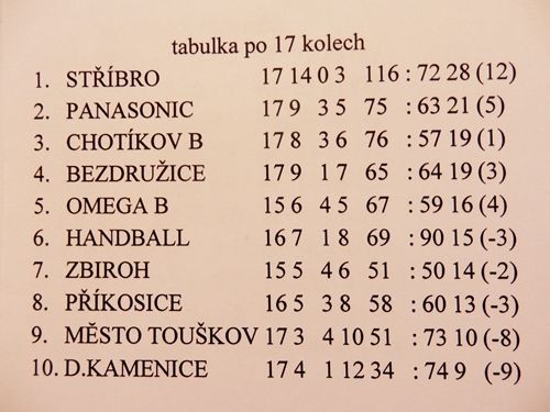 Dalšími zápasy sedmnáctého kola pokračovala Krajská soutěž mužů ledního hokeje. Stříbrská nulašestka byla hostem druhého nejlepšího týmu soutěže HC Chotíkov B a Jiskra Bezdružice nastoupila na led HC Města Touškov. HC Chotíkov B - HC STŘÍBRO 06 4:6 Sestava domácích: Suda - Kulíšek, Skála, Malata, Bohm, Fryček, Hynek, Silovský, Berec, Zoubek, Fišer, Hamp, Veselý, Masnička, Chmelíř, Lang, Kotrnoch, Rauch Sestava hostů: Šaman - Macák, Rataj, F.Turek, Velich, J.Turek, Průša, Sasz, Muzikář, Matys, Polák Góly: Malata, Silovský, Rauch, Chmelíř - J.Turek, Velich 3, Sasz, Muzikář Třetiny: 0:2, 2:1, 2:3 Vyloučení: 6:9 HC Město Touškov - Jiskra Bezdružice 2:6 Sestava hostů: Reiss - Horna Semerád, M.Velich, Řezníček, J.Velich, Ryneš, Houdek, Kalista, Kamínek, Seknička ml., Seknička st., Mojžíšek, Řezníček, Štengl, Petřina Góly: Kamínek 2, M.Velich, Seknička ml., J.Velich, Petřina Třetiny: 0:4, 0:2, 2:0