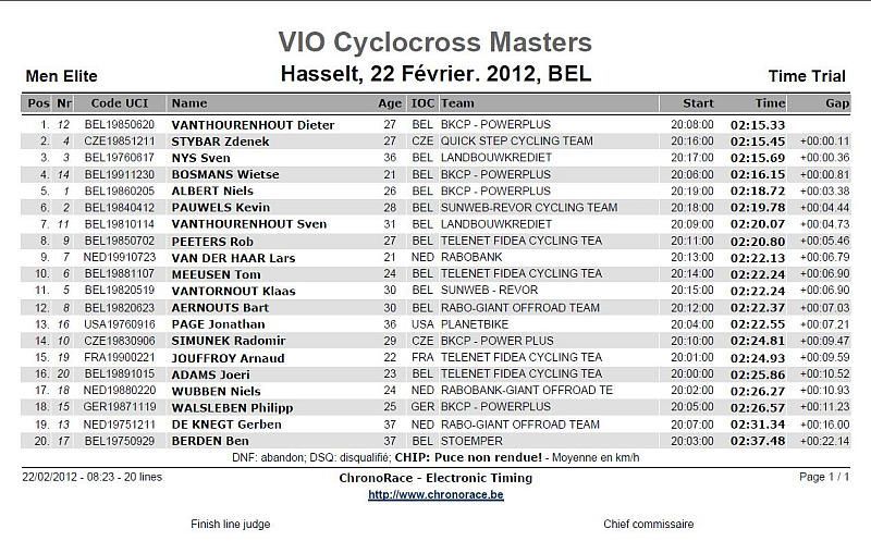 Závěrečné představení při halovém cyklokrosu ... se konalo ve středu 22.2.2012 již tradičně v halovém komplexu v belgickém Hasseltu. Přestože se závod pořádal v pracovním týdnu, program v hale začal už v 15:30 dětskými kategoriemi za přítomnosti zvučných jmen nedávné historie - Erwin Vervecken, Paul Herygers, Roland Liboton a gradoval nejdříve časovkami a pak závodem Elite ženy na 20 minut se startem v 21:00 a po nich ve 21:40 závodem Elite muži na 30 minut. Ženy ovládla mistryně světa Marianne Vos. V mužích se postupně vytříbila čtyřka - Pauwels, Štybar, Nys a Albert. Zdeňka nakonec porazil stejně jako v roce 2009 pouze mistr světa Niels Albert. Třetí skončil Sven Nys, který v poslední zatáčce udělal chybu.