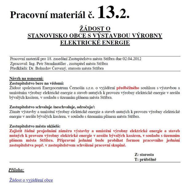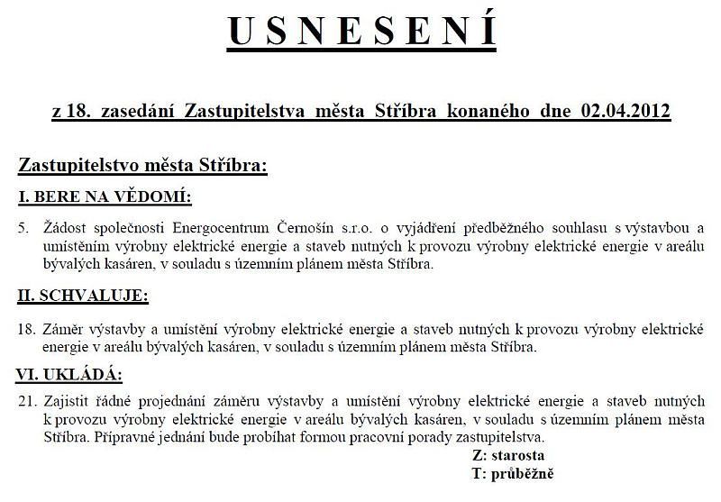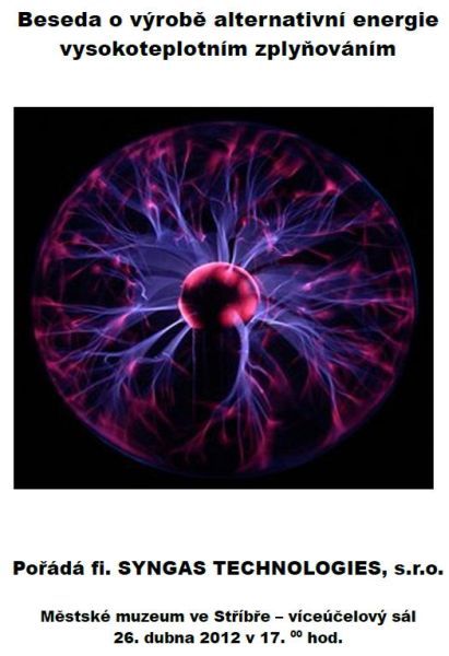 aneb jedna z možností ekologické likvidace odpadu po uzavření skládek. … Na svém jednání dne 2. 4. 2012 odsouhlasili zastupitelé záměr výstavby a umístění výrobny elektrické energie v průmyslové zóně v západní části areálu bývalých kasáren a to na základě nabídky na postavení provozu ekologické likvidace odpadu plazmovým zplyňováním odpadů a výroby elektřiny pomocí vzniklého plynu. Vyhlášení záměru ještě není realizace. Zastupitelé pouze vyjádřili vůli dále v tomto směru jednat. Na základě toho se ve víceúčelovém sále Městského muzea ve Stříbře dne 26. 4. 2012 uskutečnila beseda. Besedu zahájil Ing. Petr Strankmüller, který přítomné seznámil, že připravovaná novela zákona počítá již od roku 2013 s prudkým navýšením poplatků za nakládání s odpady a od roku 2018 se zákazem skládkování směsného komunálního odpadu. Z tohoto důvodu Plzeň plánuje do roku 2015 v Chotíkově výstavbu spalovny, která ale zdaleka nepokryje potřeby regionu, s předpokládanou cenou spalování až 3.000 Kč/tunu + doprava do Chotíkova oproti současným 500 Kč za skládkování v Černošíně. Sdružení obcí, které má vybudovaný systém svozu na skládku v Černošíně, hledá možnosti levnější likvidace odpadů než jejich vození do spalovny v Chotíkově. Proto oslovila majitele patentu na zplyňování odpadu společnost Solena Group Inc., jejíž plazmové hořáky byly původně vyvinuty za účelem testování odolnosti keramických štítů raketoplánů, které jsou při průchodu atmosférou konfrontovány s teplotami nad 2.500 stupňů Celsia, aby svojí technologii představila. V klasické spalovně se hořením vstupní suroviny uvolňuje tepelná energie, která se použije k výrobě páry a ta pak k výrobě elektrické energie nebo k vytápění. K tomu je potřeba velkého množství vzduchu a výsledkem je pak velké množství spalin na výstupu. Ty už se ale díky dokonalým filtracím do ovzduší prakticky nedostanou. Vedlejším produktem je ale až 30% popela. Při zplyňování se za pomoci extrémně vysokých teplot převádí organická hmota z pevného skupenství na plyn, který se dále využívá např. k výrobě elektřiny (3-4x více než u spalovny). Organická hmota (obsahuje uhlík) od biomasy, přes plasty až po pryž při procesu zplyňování dopadá bez přístupu vzduchu (nevznítí se) na koksové lože zahřáté plazmovými hořáky na teplotu přes 1.600 stupňů Celsia. Tím dojde k tepelnému rozštěpení (pyrolýza) molekulární struktury a vytvoření elementárních sloučenin. Laicky se "vypaří" na plyn, který se následně ochlazuje a čistí dle účelu dalšího využití a dále na inertní strusku, v jejíž krystalické mřížce skončí zabudované případné nebezpečné látky. Struska je 5x méně vyluhovatelná než sklo a lze ji tedy použít jako levnější stavební materiál. Vedlejším produktem čištění plynu je komerčně prodejná síra a dále solanka. Provoz neprodukuje sekundární toxické produkty plynné, kapalné ani pevné. Pro případnou výstavbu v západní části průmyslové zóny bývalých kasáren ve Stříbře by bylo postačující zařízení se vstupním výkonem 5 tun za hodinu, které by dovezlo cca 10-11 nákladních vozů denně ze skládky z Černošína, na které by i nadále docházelo k třídění odpadu (teoreticky je možné až do vyhnívaček), takže do Stříbra by se vozilo již jenom certifikované "palivo" z vytříděného odpadu, které svojí výhřevností může téměř konkurovat hnědému uhlí. Zároveň se předpokládá, že by se touto technologií postupně zlikvidovali již uzavřené skládky okolo Stříbra, které jsou stále potencionálním nebezpečím. Prakticky by to vypadalo tak, že by nákladní automobil zajel do uzavřeného zastřešeného prostoru a tam by odpad složil do podtlakového bunkru, ze kterého je vzduch hnán přes biofiltr včetně odstranění zápachu. Nákladní automobil by pak odjel nebo naložil stavební strusku, které se vyprodukuje cca 0,318 tun za hodinu, tedy cca 2.500 tun za rok z cca 40.000 tun zpracovaného odpadu ročně. Zařízení se zhruba na měsíc v roce odstavuje. Technologie spotřebuje na svůj provoz cca 20% vyrobené elektřiny a i tak by byla schopná dodávat do sítě 7,3 MW/hodinu. Ochlazováním plynu vzniká levné teplo, které by se nechalo v průmyslové zóně kasáren využít, případně dovést až do obytné zóny. I když je zařízení plně automatizované, jeho obsluhu by ve 3 směnách zajišťovalo dohromady cca 20 pracovníků. Hladina hluku je menší než z ulice. Plocha celého pozemku 150 x 120 m a maximální výška do 15 metrů, přičemž by bylo možné i částečné zapuštění do země. Po přednášce následovala diskuse, kde bylo např. zodpovězeno, že plazmový reaktor nemůže vybuchnout, protože je v podtlakové komoře. Syntézní plyn vzniklý zplyňováním je v podstatě svítiplyn, který byl dříve rozváděn do domácností. Na dotaz ohledně dovozu odpadu ze zahraničí bylo zodpovězeno, že přeprava odpadů do ČR za účelem jejich odstranění je podle §54 zákona o odpadech odstavec 2) zakázána. Další obava byla z rozšiřování zařízení formou skládačky a v důsledku toho dovážení většího množství odpadů přes město ze všech směrů. Bylo doporučeno, aby město chtělo svého zástupce v provozující společnosti, který na to bude dohlížet. Navíc vše lze dopředu ošetřit smluvně. I když zařízení při pohledu na zákonné emisní limity neprodukuje téměř nic, opakovaly se obavy z umístění na západě města, kdy převažující západní větry vanou do města. Přednášející pan Grisha Kahlen upozornil, že auta starší 15ti let ve Stříbře vyprodukuji více zplodin než motory používané v