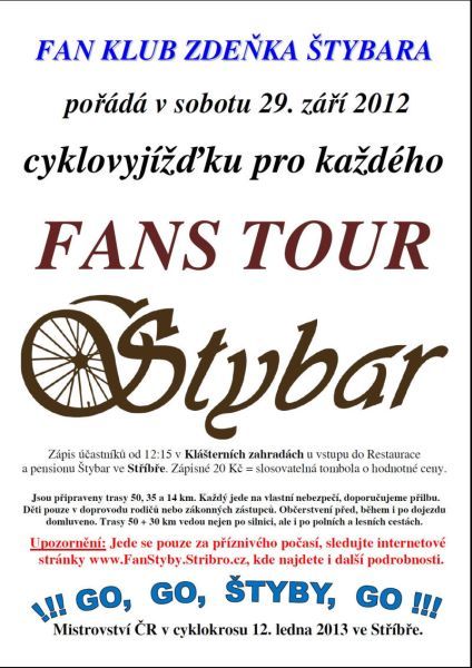Fan Klub Zdeňka Štybara pořádal cyklovyjížďku pro každého … po okolí Stříbra nejen po silnici, ale i po polních a lesních cestách v sobotu 29. 9. 2012. Nezávodilo se, jelo se kvůli pohybu na čerstvém vzduchu a za poznáním okolí Stříbra. Účastníky přivítala sice zatažená obloha, ale nepršelo a nefoukal vítr. Teplota se pohybovala okolo pro pohyb příjemných 17 °C. Sraz účastníků byl těsně po poledni v Klášterních zahradách u Restaurace a penzionu Štybar, kde byl v malém altánku zápis, při kterém každý účastník obdržel popis tras s mapkou, podepsanou fotografii dvojnásobného exmistra světa v cyklokrosu Zdeňka Štybara, číslo do tomboly losované po dojezdu a pamětní samolepku na kolo. U zápisu bylo možné zakoupit tričko nebo čepici "Fanoušek Zdeňka Štybara". Počet zapsaných se zastavil na čísle 42. Před jednou hodinou odpoledne se účastníci shromáždili na cestě před vchodem do Klášterních zahrad, vyslechli si instrukce k trase a poté odjeli na trasy 50, 30 a 14 km, které byly až do Kšic společné. Každý účastník si tedy mohl vybrat až v průběhu jízdy, jakou trasu pojede nebo si trasu upravit podle svého. Ve Kšicích se odkláněla trasa 14 km a za kopcem za Kšicemi na křižovatce Lomnička-Trpísty se rozdělovala trasa 30 a 50 km. Trasa 50 km vedla přes vyhlídku na Šipíně a kolem Gutštejna zpět na zmíněnou křižovatku, odkud pak trasy společně pokračovaly k železničnímu mostu přes vodní nádrž Hracholusky a zpět do Stříbra. Restaurace při trase byly otevřené, takže se účastníci mohli i v průběhu jízdy občerstvit. Po dojezdu všech tras se losovalo 40 připravených cen. Jednalo se o cyklistické potřeby jako přilby, brýle, pumpička, láhve na pití, blikačky, čepice, ponožky, rukavice, prádlo, atd. Jako poslední byla vylosovaná hlavní cena, kterou byl dres mistra světa Zdeňka Štybara. Fan Klub Zdeňka Štybara děkuje za pomoc s cyklovyjížďkou Restauraci a penzionu Štybar, firmám pro cyklisty CykloCentrum Stříbro a Cykloservex Stříbro a za mediální podporu počítačové a účetní firmě SoftAg STŘÍBRO s.r.o. Fotogalerie z cyklovyjížďky 29. 9. 2012. Video z cyklovyjížďky 29. 9. 2012. Trasa 50 km - vede i po polních a lesních cestách. Variantní trasa železniční most -> Stříbro. Trasa 30 km - vede i po polních a lesních cestách. Variantní trasa železniční most -> Stříbro. Trasa 14 km - vede pouze po silnici. Jak se stát členem Fan klubu Zdeňka Štybara? Mistrovství ČR v cyklokrosu 2013 ve Stříbře! Dne 02.10.2012:Ing. Josef Hrábek #ZŠ# Pro reakci na článek musíte být přihlšen |