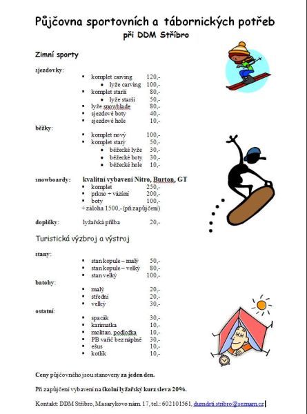 Dům dětí a mládeže Stříbro ... nabízí zapůjčení sportovních potřeb pro sjezdové či běžecké lyžování a snowboardy. Při zapůjčení vybavení na školní lyžařský kurz poskytujeme slevu ve výši 20%. Podrobněji po rozkliknutí ceníku níže. Dne 11.12.2012:Mgr. Miroslav Cvrk Pro reakci na článek musíte být přihlšen |