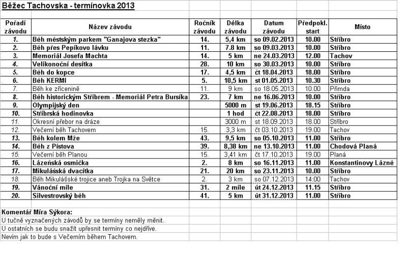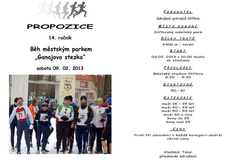 14.ročník populárního běžeckého závodu Sdružení vytrvalců Stříbro pořádá již 14.ročník běžeckého závodu: "Běh městským parkem - Ganajova stezka". Jedná se o 1.letošní závod zařazený do celoročního běžeckého seriálu "O nejlepšího běžce Tachovska". Závod se koná v sobotu 9.2.2013, start je v 10:00 hodin na stadionu ve Stříbře. Běží se většinou v členitém terénu, cestami v městském parku. Podrobnosti jsou uvedeny v přiložených propozicích a více se také dočtete na stránkách www.svstribro.cz. Celý program běžeckého seriálu "O nejlepšího běžce Tachovska" je také uveden v příloze, podrobnosti se dočtete na uvedených webových stránkách, kde jsou také publikovány výsledky jednotlivých závodů, průběžné pořadí "Běžce Tachovska", fotogalerie ze závodů a mnoho dalších zajímavostí. Tak sportovci, chcete se poměřit se stejně postiženými jedinci? Tak neváhejte a 9.2. Vás čekáme na startu!!! Jirka Trávníček http://www.svstribro.cz/