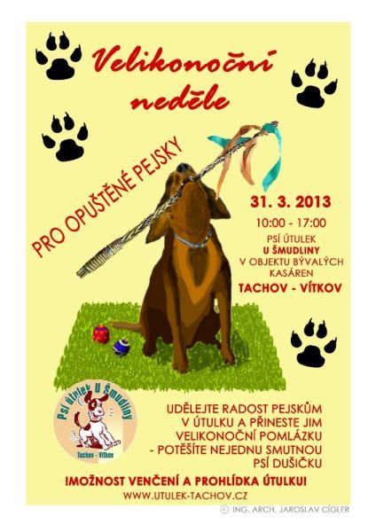 Psí útulek u Šmudliny Vás srdečně zve na Velikonoční neděli 31.3.2013 od 10-17h. Velikonoční neděle pro opuštěné pejsky Psí útulek u Šmudliny Vás srdečně zve na Velikonoční neděli 31.3.2013 od 10-17h. Udělejte radost pejskům v útulku a přineste jim velikonoční pomlázku.Potěšíte nejednu smutnou psí dušičku. Gabriela Jägerová provozovatelka útulku u Šmudliny Tachov-Vítkov