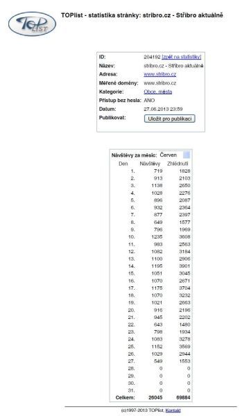 Ve čtvrtek 27. června 2013 překročila návštěvnost ... našeho webového serveru 2.000.000 návštěvníků. Redakce našeho serveru děkuje všem návštěvníkům za přízeň. Zároveň si dovolujeme návštěvníky upozornit na zajímavé odkazy na internetové stránky většinou z našeho regionu. Do těchto odkazů zařazujeme internetové stránky nepodnikatelských subjektů na základě toho, že oni dají na svoje stránky odkaz na náš web. Pokud hledáte podnikatele, tak je můžete najít v katalogu firem. Zápis firemního profilu včetně odkazu na firemní internetové stránky je možné si objednat dle platné ceny uvedené v ceníku, ve kterém najdete i další možnosti inzerce. Podnikatelé poskytující stravovací služby si mohou přiobjednat zařazení do "Aktuální nabídky jídel on-line". Jak můžete zjistit po kliknutí níže, tak v aktuálním měsíci je průměrná denní návštěvnost 980 přístupů denně. Další informace získáte po kliknutí na "Statistiku" vlevo dole na úvodní stránce. Chcete-li i Vy zveřejňovat nepodnikatelské upoutávky na akce či psát o dění v regionu na našem webu, napište nám a my Vám pošleme návrh dohody, jejímž podpisem na sebe převezmete odpovědnost za zveřejňované informace, my Vás zaškolíme a můžete publikovat. Chcete-li pouze jednou za čas informovat o konání nepodnikatelské akce, stačí se ZDE zaregistrovat a zapamatovat si přihlašovací údaje. Kdykoli se pak můžete úplně vlevo nahoře přihlásit a sami si zadat upoutávku na akci po kliknutí na "Akce (Přidat novou)" vlevo v hlavním menu. Většinou do tří dnů pak některý z webmasterů akci zveřejní. Hezký den všem přeje redakce www.stribro.cz