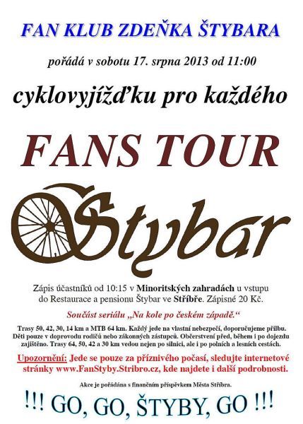 Fan Klub Zdeňka Štybara uspořádal 2. ročník cyklovýletu. … Vloni byl cyklovýlet pořádán na konci září a i když bylo celkem příjemných 17 stupňů, tak zatažená obloha odradila některé zájemce. Letos tomu bylo podobně, ovšem pro změnu byla v sobotu 17. srpna 2013 jasná obloha a 22 stupňů ve stínu a 27 stupňů na sluníčku již v 10:00. Ovšem ti, kteří přišli, nelitovali. Protože se nezávodilo, jel si každý podle svého a pohyb na čerstvém vzduchu za poznáním okolí Stříbra si všichni náležitě užili. Aby si totiž krásné cyklistické trasy severně od Stříbra mohlo projet více cyklistů, ponechali pořadatelé trasy stejné jako vloni, pouze přibyla 42 km trasa zkrácením trasy 50 km. Po okolí Stříbra tedy nejen po silnici, ale i po polních a lesních cestách byly připraveny trasy v délce 50, 42, 30 a 14 km. Jako obohacení členové Cyklodraku Stříbro navíc coby průvodci nabídli účastníkům možnost vyzkoušet si 64 km MTB trasu. Sraz účastníků byl těsně po desáté hodině v Klášterních zahradách u Restaurace a penzionu Štybar, kde byl v malém altánku zápis, při kterém každý účastník obdržel popis tras s mapkou, podepsanou fotografii dvojnásobného exmistra světa v cyklokrosu Zdeňka Štybara, číslo do tomboly losované po dojezdu a pamětní samolepku na kolo. U zápisu bylo možné zakoupit tričko nebo čepici "Fanoušek Zdeňka Štybara". Oproti loňským 42 účastníkům se jich letos zúčastnilo 56. Před jedenáctou hodinou se účastníci přesunuli na cestu před vchodem do Klášterních zahrad, jde si vyslechli instrukce k trasám a poté přes nově zrekonstruované náměstí vyrazili na připravené trasy, které zpočátku byly společné, takže teprve v v průběhu jízdy se mohli rozhodnout, jakou trasu pojedou nebo si případně trasu upravit podle svého. Ve Kšicích se odkláněla dětská trasa 14 km a 64 km MTB a za kopcem za Kšicemi na křižovatce Lomnička-Trpísty se rozdělovala trasa 30, 42 a 50 km. Trasy 42 a 50 km vedly přes vyhlídku na Šipíně a kolem Gutštejna zpět na zmíněnou křižovatku, odkud pak trasy vyjma 42 km, která v Erpužicích zahnula zpět do Stříbra, společně pokračovaly k železničnímu mostu přes vodní nádrž Hracholusky a zpět do Stříbra. Restaurace při trase byly otevřené, takže se účastníci mohli i v průběhu jízdy občerstvit. Po dojezdu všech tras se losovala tombola ze všech zúčastněných cyklistů. V tombole byly převážně cyklistické potřeby. Jako poslední se losovaly hlavní ceny - tričko „Fanoušek Zdeňka Štybara, originální čepice Omega Pharma-Quick Step s vlastnoručním podpisem Zdeňka Štybara a jako hlavní cena cyklistický dres. Fan Klub Zdeňka Štybara děkuje za pomoc s cyklovyjížďkou Restauraci a penzionu Štybar, prodejně a servisu pro cyklisty Cykloservex Stříbro, za mediální podporu počítačové a účetní firmě SoftAg STŘÍBRO s.r.o. a Městu Stříbru za finanční podporu. A v neposlední řadě všem účastníkům. Jak se stát členem Fan klubu Zdeňka Štybara? Dne 17.08.2013:Ing. Josef Hrábek #ZŠ# Pro reakci na článek musíte být přihlšen |