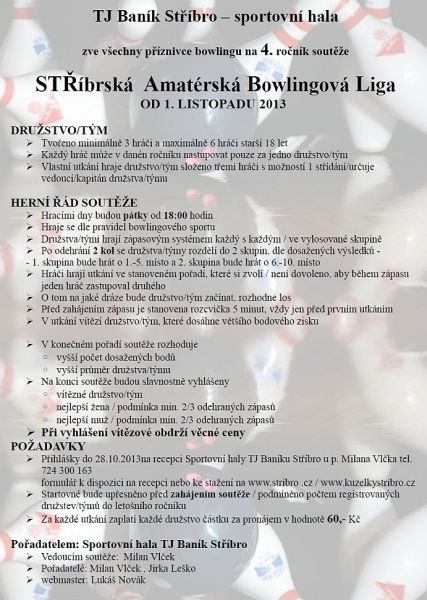 formulář k dispozici na recepci nebo ke stažení na www.stribro .cz / www.kuzelkystribro.cz - Startovné bude upřesněno před zahájením soutěže / podmíněno počtem registrovaných družstev/týmů do letošního ročníku