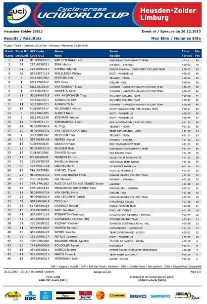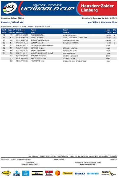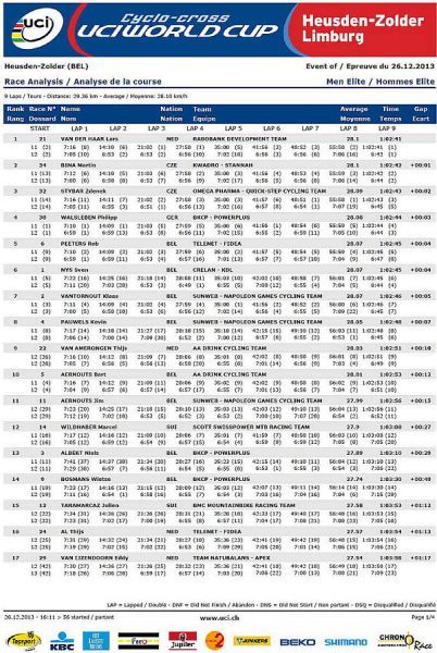 Výsledky muži Světový pohár Heusden-Zolder Belgie 26.12.2013: Internetové stránky SP Heusden-Zolder. Výsledky (results) na stránkách UCI. UCI Ranking - Cyclo Cross 2013/2014. Jak se stát členem Fan klubu Zdeňka Štybara? Dne 26.12.2013:Ing. Josef Hrábek #ZŠ# Pro reakci na článek musíte být přihlšen |