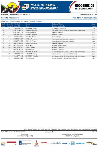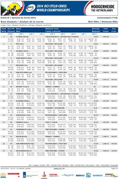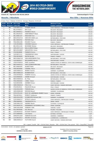 Výsledky World Chamionship Cyclocross 2014 Hoogerheide Elite 2.2.2014: Results World Chamionship Cyclocross 2014 Hoogerheide. Výsledky (results) Men Elite . Dne 02.02.2014:Ing. Josef Hrábek #ZŠ# Pro reakci na článek musíte být přihlšen |