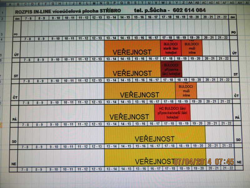 Po demontáži chladícího zařízení byl na ploše hřiště položen povrch, na kterém můžete provozovat in-line bruslení, florbal, hokejbal a in-line hokej. VSTUP NA PLOCHU POUZE V PŘEZŮVKÁCH, které nečerní, ze stejného důvodu nepoužívat (sundat) brzdu z kolečkových bruslí. BRUSLENÍ NA VLASTNÍ NEBEZPEČÍ ! DOPORUČUJEME POUŽÍVAT PŘILBU A CHRÁNIČE ! V PŘÍPADĚ MISTROVSKÉHO UTKÁNÍ BULDOKŮ (hokejbal žáci) MŮŽE DOJÍT KE ZMĚNĚ OTEVÍRACÍHO ČASU. VSTUPNÉ: děti do 5 let - zdarma, 5 – 15 let - 20,- Kč dospělí 30,- Kč školy 10,- Kč pronájem plochy 500,- Kč/hod otevřeno pro veřejnost: úterý-středa 13 - 17 hodin čtvrtek 13 - 18 hodin pátek 13 - 16,30 hodin sobota 13 – 20 hodin neděle 13 – 20 hodin