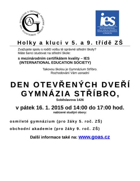 Kdo v listopadu nevyužil příležitosti navštívit školu a získat informace o přijímacím řízení, o průběhu studia a možnostech uplatnění po absolvování školy, bude mít ještě šanci 16. ledna 2015 od 14.00 do 17.00. Páteční odpoledne mají žáci 5. a 9. tříd základních škol a jejich rodiče příležitost důkladně si prohlédnout školní budovu, její moderní vybavení i zázemí pro studenty v době mimo vyučování v rámci Dne otevřených dveří Gymnázia Stříbro. Uchazeči o studium se dozvědí, že ve školním roce 2015/2016 škola nabízí dva studijní obory: - obchodní akademie se zaměřením na podnikání a služby cestovního ruchu (pro žáky 9. tříd ZŠ) a - osmileté gymnázium (pro žáky 5.tříd ZŠ). Přijďte, jste srdečně zváni. Na setkání se těší učitelé a vedení školy.