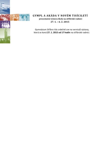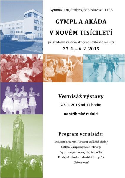 Pozvánka na vernisáž výstavy Gymnázium a obchodní akademie jsou již dlouhá léta neodmyslitelnou součástí společenského a kulturního života celého města. Svoji historii, především však současnost a budoucnost by tato vzdělávací instituce ráda připomněla hned v prvním měsíci nového roku v rámci prezentační výstavy s názvem Gympl a akáda v novém tisíciletí. Zahájení výstavy proběhne 27.ledna 2015 v 1700 slavnostní vernisáží ve vstupních prostorách stříbrské radnice. V rámci kulturního programu budete moci zhlédnout vystoupení žáků školy, ale také se budete moci setkat s úspěšnými absolventy Gymnázia a Obchodní akademie Stříbro, možná právě vašimi spolužáky. Kromě pestrého odpoledního programu bude návštěvníkům k dispozici prodejní stánek obchodní firmy studentů OA, občerstvení a domů si budou moci odnést i některý z upomínkových předmětů.
