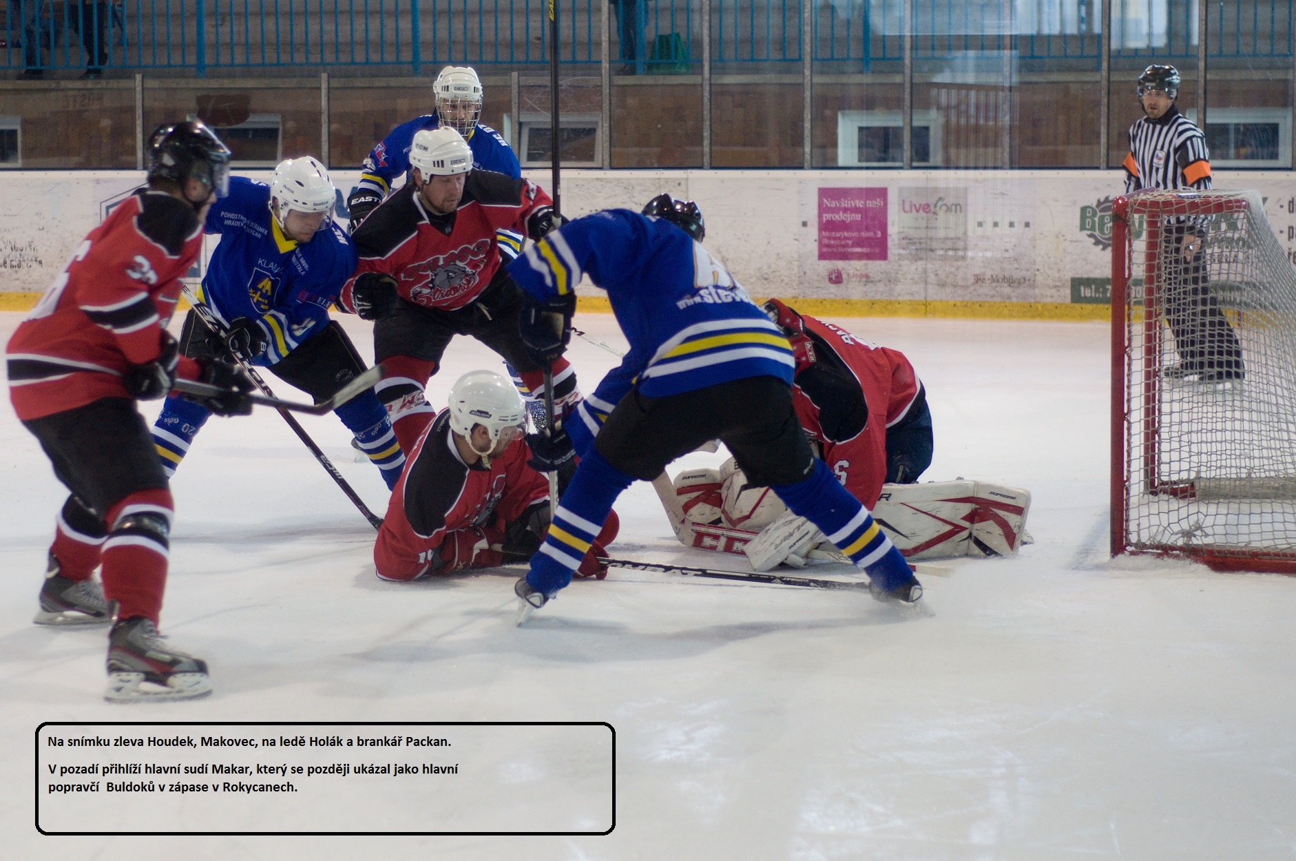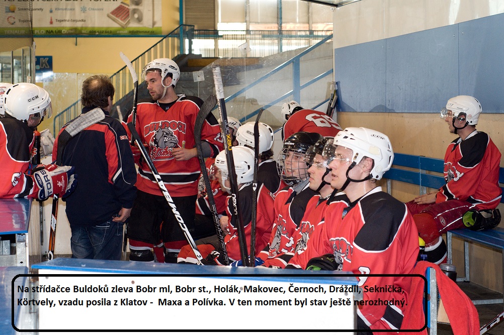 Hokejové klání krajské soutěže skupiny A play-off. 26.3.2014 Buldoci v prním zápase play-off narazili na hokejového a nadmíru zdatného soupeře z Klabavy. Utkání bylo hrané z obou stran na hraně únosnosti pravidel, ovšem sudí trestal pouze mužstvo hostí. Střetnutí dospělo do závěrečné třetiny za nerozhodného stavu a v momentě, kdy se lámal chleba v zápase, hlavní sudí neuznal Buldokům dvě branky, které by hostům zaručovaly trochu jistoty a vedení v zápase. Bohužel opak byl pravdou. Neuznané branky hosty srazili na kolena a v koncovce zápasu rozhodčí poslal hosty do třech a zápas v tento moment byl rozhodnutý. Místo toho, aby lavici trestaných zahříval domácí hráč za krvavé zranění v obličeji hostujícího obránce a vyfasoval 5-minutový trest. Nepovedené utkání hlavního sudího Buldoci prohráli až v samotném závěru, když ještě pět minut před závěrečným hvizdem vedli v utkání o jednu branku. DTJ Klabava – HC Buldoci Stříbro : 6 : 3 (1:0)(1:1)(4:2) Branky: Polák 1+0, Arnet 1+1, Hirman 1+2, Průša 1+1, Michalides 1+0, Marek 1+0 za domácí Klabavu Houdek 1+0, Sládek 1+0, Červenka 1+0, Černoch, Staněk a Maxa 0+1 za Buldoky