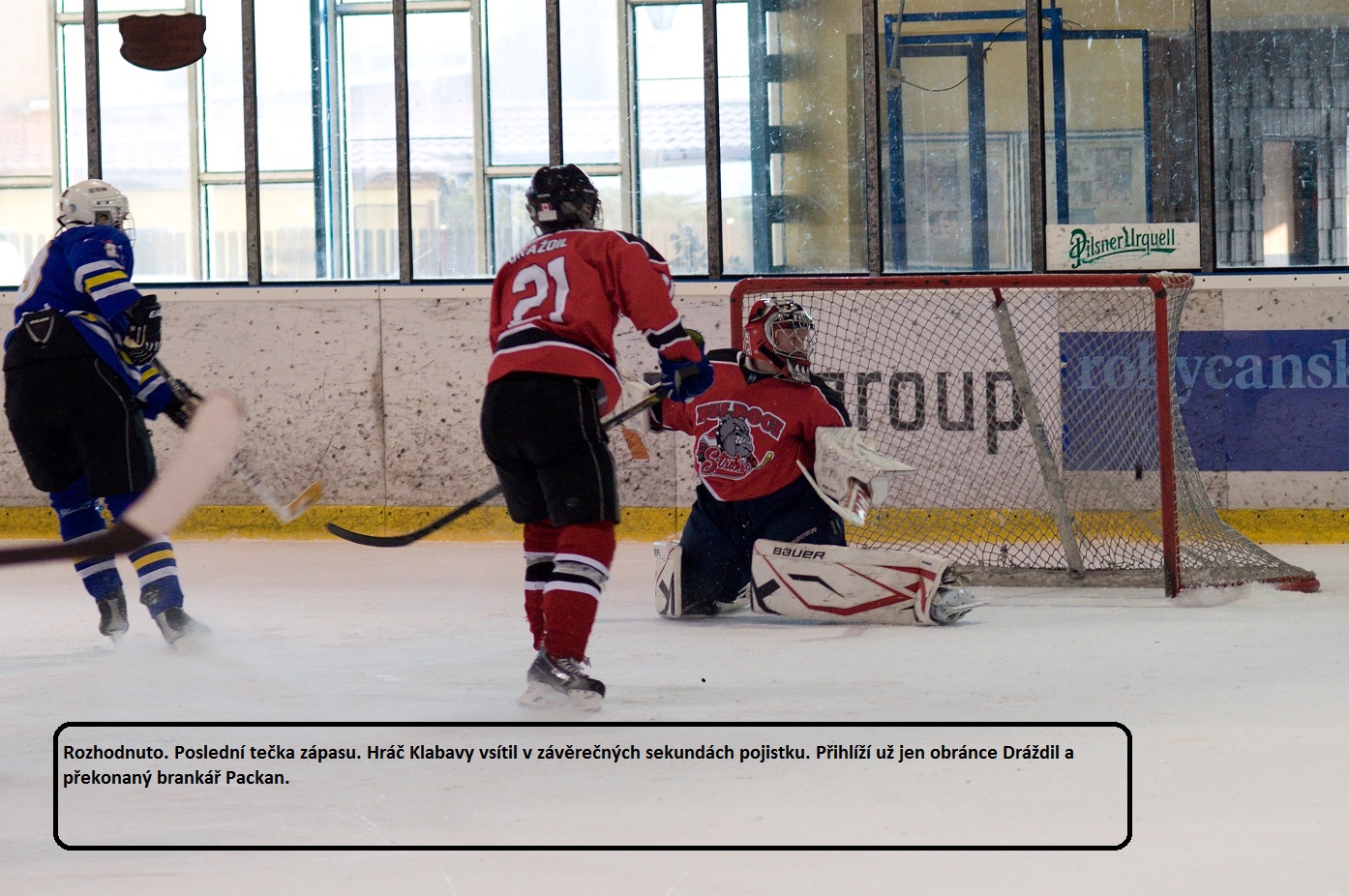 Dvojzápas tak dospěl do patové situace, kterou měli rozlousknout až samostatné nájezdy. Na obou stranách zůstala možnost ke skórování nevyužitá, neboť všichni aktéři narazili na výborné gólmany na obou stranách. Rozhodl až šestý nájezd na jehož konci byl úspěšný vykonavatel Polák, který tak posunul do semifinále hostující DTJ Klabavu.