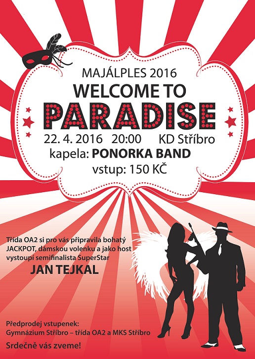 Třída OA2 Gymnázia Stříbro zve širokou veřejnost na Majálples 2016, který se uskuteční 22.4.2016 v KD Stříbro. Lístky budou v prodeji od 9.3.2016 v OA2 Gymnázia Stříbro, případně v MKS. Více informací v příloze.