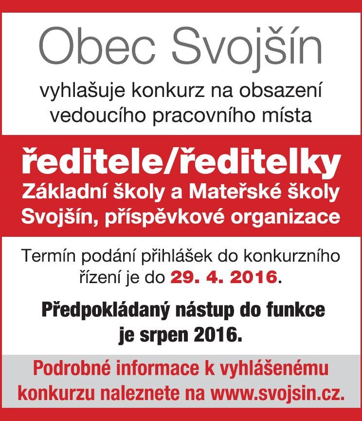 Obec Svojšín vyhlašuje KONKURS na obsazení funkce ředitele/ředitelky Základní školy a Mateřské školy Svojšín, příspěvkové organizace