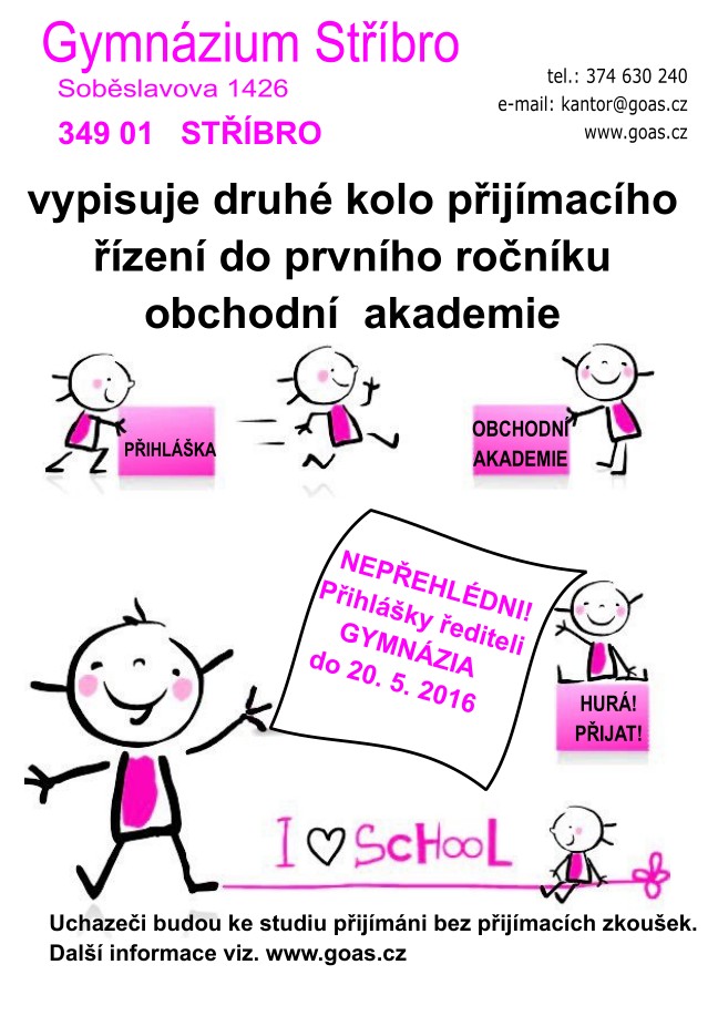 Pro školní rok 2016 / 2017 bude Gymnázium, Stříbro, Soběslavova 1426 otevírat: Více informací v příloze. Dne 26.04.2016:Mgr. Zuzana Kalčíková Pro reakci na článek musíte být přihlšen |