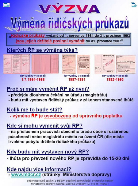 Řidičské průkazy vydané od... ... 1. července 1964 do 31. prosince 1993 jsou jejich držitelé povinni vyměnit do 31. prosince 2007.