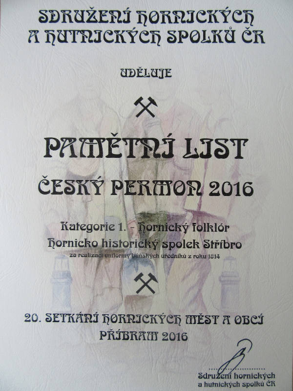 O víkendu 10.-12. června 2016 se stříbrští horníci … zúčastnili v Příbrami 20. setkání hornických měst a obcí ČR a zároveň 16. evropského dne horníků a hutníků. Organizátoři přijali celkem 110 přihlášek a při hornické parádě v sobotu bylo v průvodu cca 2 140 horníků a hutníků z Polska, Maďarska, Slovenska, Rakouska, Německa, Ukrajiny, Slovinska a samozřejmě domácí české hornické spolky v plné síle. Stříbro přijelo do Příbrami v síle 27 osob i se zástupci ostrostřelecké stříbrské gardy, kteří v průvodu uváděli příbramské okolostojící diváky do transu. V pátečním podvečeru se konalo na příbramském náměstí slavnostní zahájené celé akce. Počasí bylo hornickému klání příznivě nakloněno a po celou dobu oslav bylo velmi příjemně. Po úvodním zahájení celé akce se davy horníků postupně přesouvaly na druhou scénu, a to na Březové Hory, na místní náměstí a k dolu Marie, kde probíhal trvale až do nočních hodin program. Cca kolem 22,00 hod se nad Březovými Horami rozpoutalo ohňostrojové peklo. V sobotním dopoledni jsme se již připravovali na slavnostní průvod, který byl na Svaté Hoře zahájen bohoslužbou, a poté se již 122 delegací řadilo k hornické parádě, která se vydala kolem horní školy, hlavní třídou ke kostelu, v tento moment se průvod otočil a část trati šel proti sobě. Co stříbrští k tomu mohou jenom dodat, po delší době něco podobného co proběhlo naposledy při 14. setkání v roce 2010 ve Stříbře, Pražskou ulicí souběžně s trasou průvodu až na příbramské náměstí, kde se pod tribunou řadilo nevídané množství spolkových hornických a hutnických praporů ze všech zúčastněných zemí. Musíme konstatovat, že taková událost se konala v České republice poprvé od založení tradice setkávání hornických s hutnických spolků Evropy (minule se setkání konalo na Slovensku, před tím v Holandsku). Během oficiálních proslovů došlo na předání putovního praporu setkávání hornických měst a obcí ČR z rukou primátora města havířova do rukou starosty královského horního města Příbrami. Mimo jiné se předával putovní hornický flek, který se poprvé předával ve Stříbře a také na došlo na předání hornické švancary nebo kilofu, tuto tradici rovněž nastavilo město Stříbro. Proběhlo mnoho zdravic a proslovů, než došlo na dekorování hornických standart a praporů. Hornické prapory ze Stříbra dekoroval šéf strany TOP pan Miroslav Kalousek. Na závěr zazněla státní hymna a hornická hymna „Hornický stav budiž velebený“. Pro účastníky setkání bylo připraveno velké množství doprovodných programů. Každému dle jeho výběr, zálib a možností. Po skončení oficialit se většina účastníků opět přesunula na Březové Hory. Zástupci hornických spolků, představitelé horních měst a zahraničních delegací byli pozváni na setkání se starostou města Příbrami. V podvečerních hodinách se v kostele sv. Prokopa na Březových Horách konala poslední oficiální akce, a to předávání cen Český permon za rok 2016. Představitelé Hornického spolku Stříbro si převzali při této příležitosti cenu Českého permona 2016 v kategorii „Hornický folklór“ na výrobu a rekonstrukci 2 uniforem báňských úředníků z roku 1814. Prezentace těchto uniforem již několikrát proběhla v Tachovském deníku, Zpravodaji města Stříbra, na internetových stránkách, na stránkách hornického spolku a v dalších periodikách. První představení těchto uniforem proběhlo v únoru při setkání hornických spolků s místopředsedou Senátu parlamentu ČR Přemyslem Sobotkou, další představení včetně replik 2 uniforem báňských úředníků z roku cca 1840 bude v září 2016 na akci Hornického spolku ve Stříbře. Program opět pokračoval do pozdních večerních hodin. Děkujeme městu Příbram za perfektní zvládnutí celé akce. Stříbrští horníci vyjadřují pořadatelům, včetně místních hornických spolků, bez jejichž pomoci by k této akci nemohlo dojít, hlubokou poklonu. Nashledanou příští rok na 21. setkání v Chomutově. Zdař Bůh