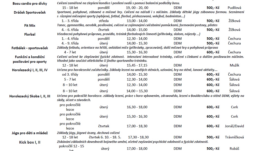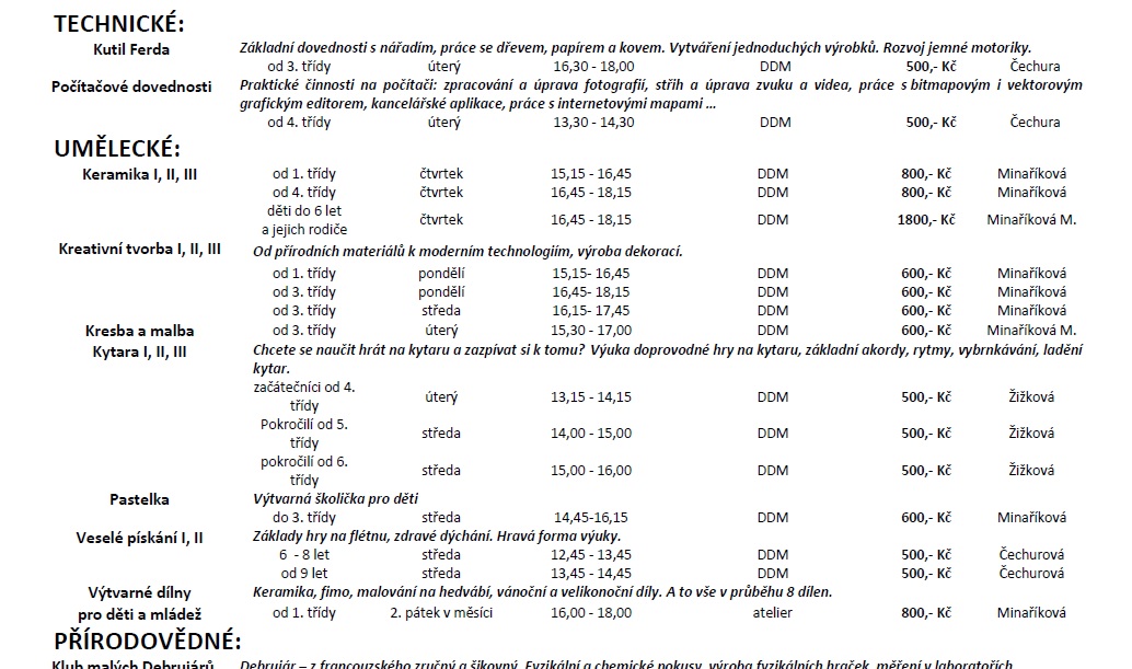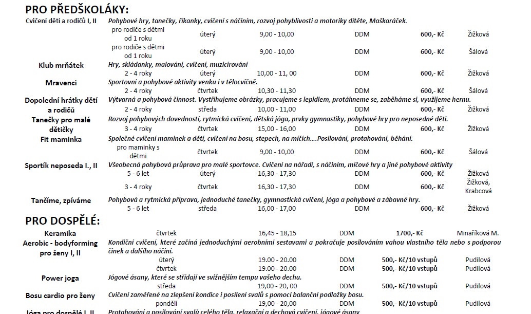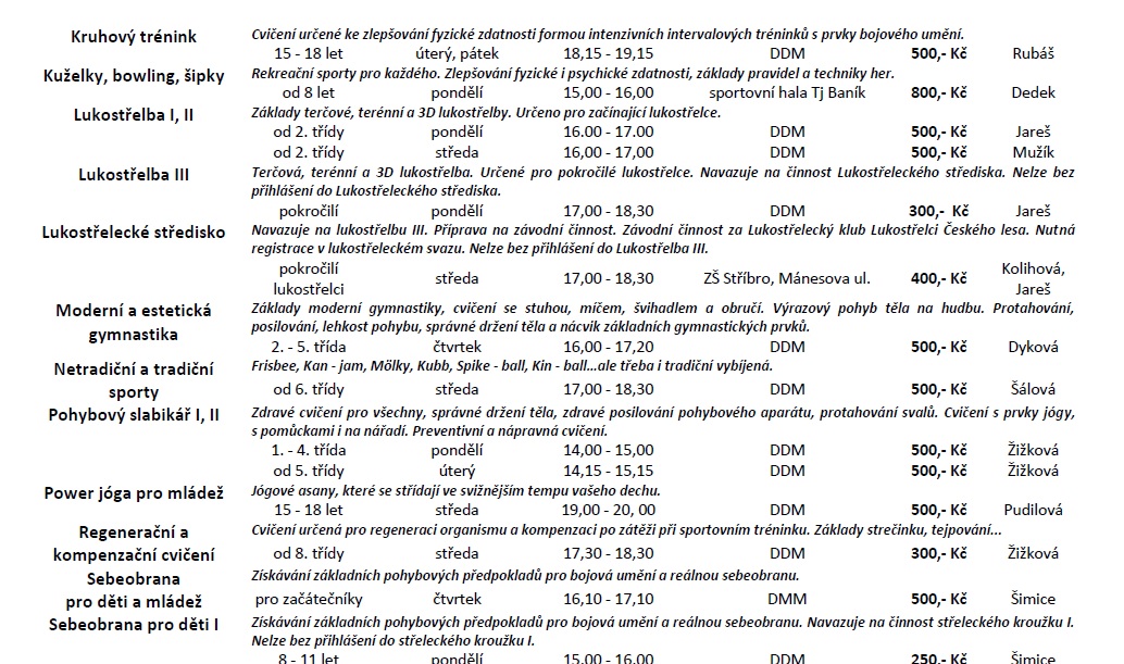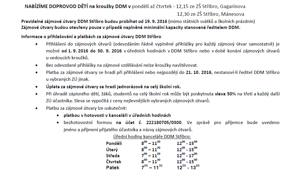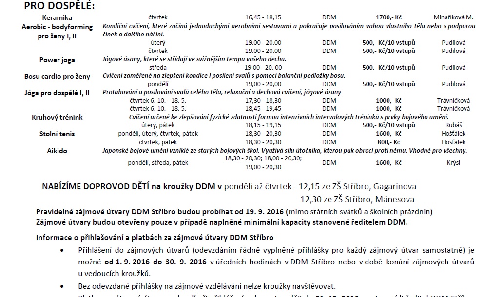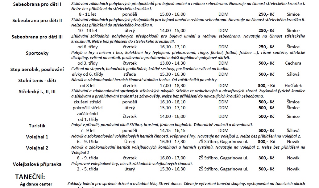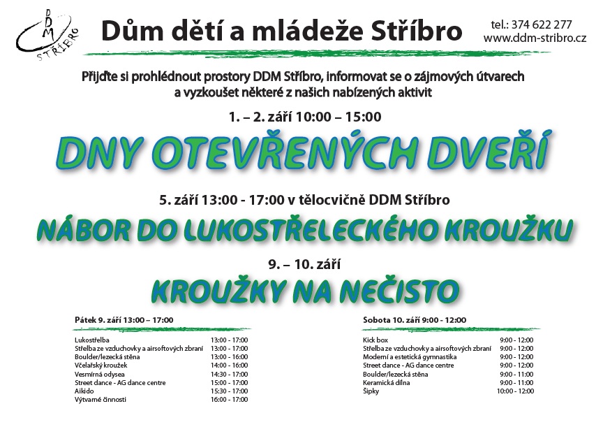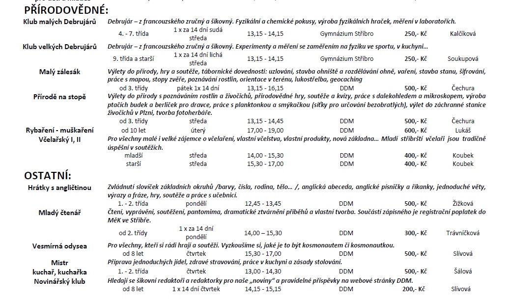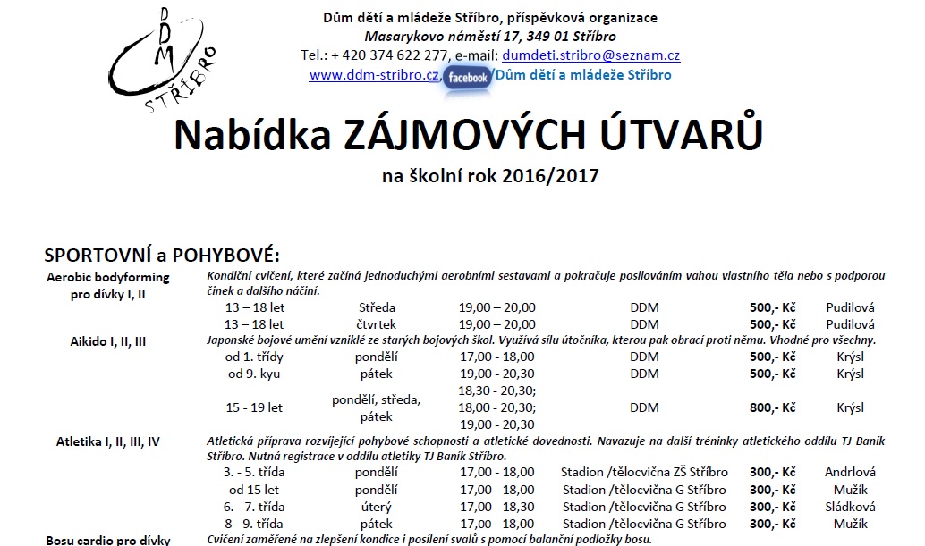 Dům dětí a mládeže Stříbro bude i v novém školním roce nabízet volnočasové aktivity s různou náplní pro zájemce všech věkových kategorií, převážně však pro děti a mládež školního věku. Tradiční nabídka bude rozšířena o kroužky moderní a estetické gymnastiky, streetdance, kuželek a bowlingu, čtenářského kroužku, kroužků malých a velkých debrujárů, funkčního posilování a dalších. Zájmové útvary letos zahájí svou činnost 19. září 2016. Ve dnech 1. – 2. září bude možno se v rámci Dnů otevřených dveří DDM Stříbro seznámit s nabídkou kroužků a prohlédnout si prostory DDM. Většina nabízených činností se může vyzkoušet během akce „Kroužky na nečisto“ 9. a 10. září. Seznamy nabízených kroužků a informace o činnosti DDM naleznete také na www.ddm-stribro.cz, facebooku a nástěnkách DDM. Do kroužků je možno se hlásit od 1. 9. 2016 do doby naplnění maximální kapacity kroužku v kanceláři DDM Stříbro. R. Mužík Dne 29.08.2016:Jitka Slívová Pro reakci na článek musíte být přihlšen |